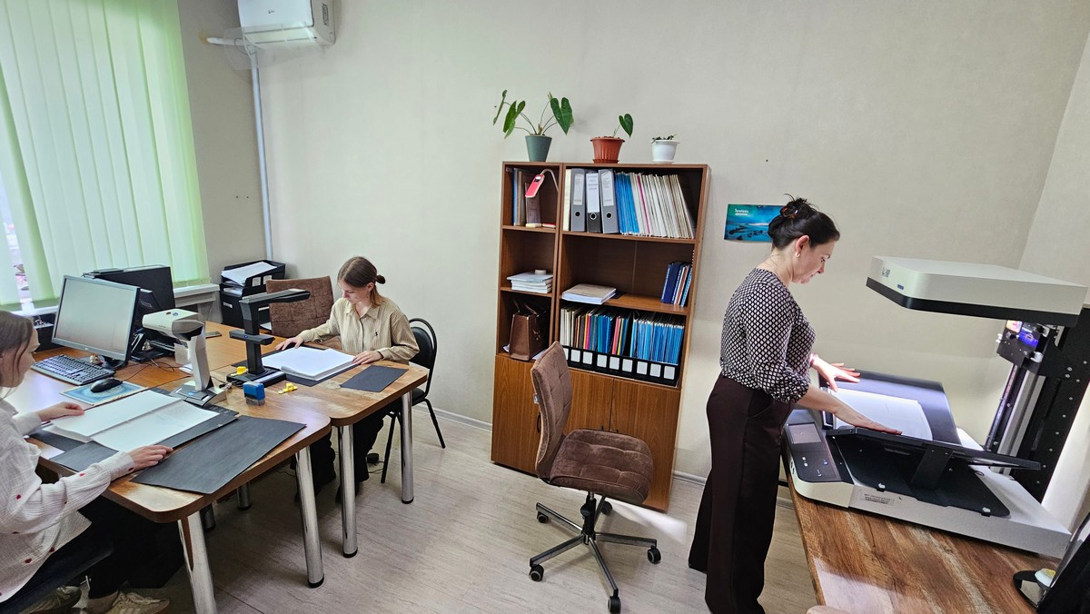На сегодняшний день в отделе учета сохранности и научно-справочного аппарата имеется два визуализатора и планетарный сканер, что позволило проводить одновременную работу по оцифровке трем архивистам отдела учета сохранности и научно-справочного аппарата. В первую очередь оцифровываются документы постоянного срока хранения и учетные документы.