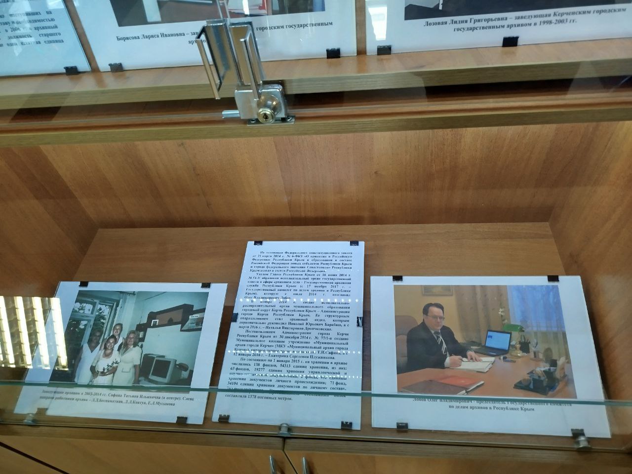На выставке представлены документы и фотографии, связанные с организацией и деятельностью Керченского архива, начиная с 20-х годов XX века и в современных условиях, а также освещена деятельность Государственного комитета по делам архивов Республики Крым.