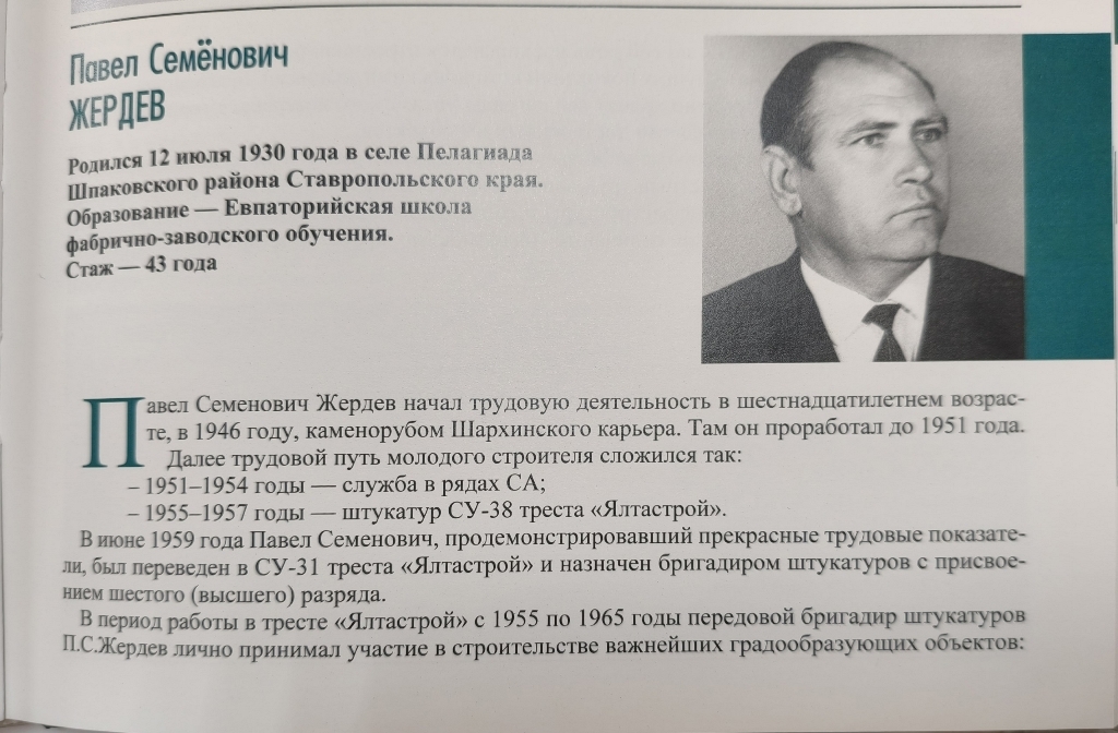 Среди многих ветеранов строительства Ялты в книге представлена информация и об отце Валентины Жердевой – Павле Жердеве. В ней освещена его трудовая деятельность, награды и поощрения: правительственная награда орден «Трудового Красного Знамени», грамоты ЦК ВЛКСМ, многочисленные почетные грамоты, занесение в «Книгу Почета» «Главчерноморморскстроя» и на доску почета.