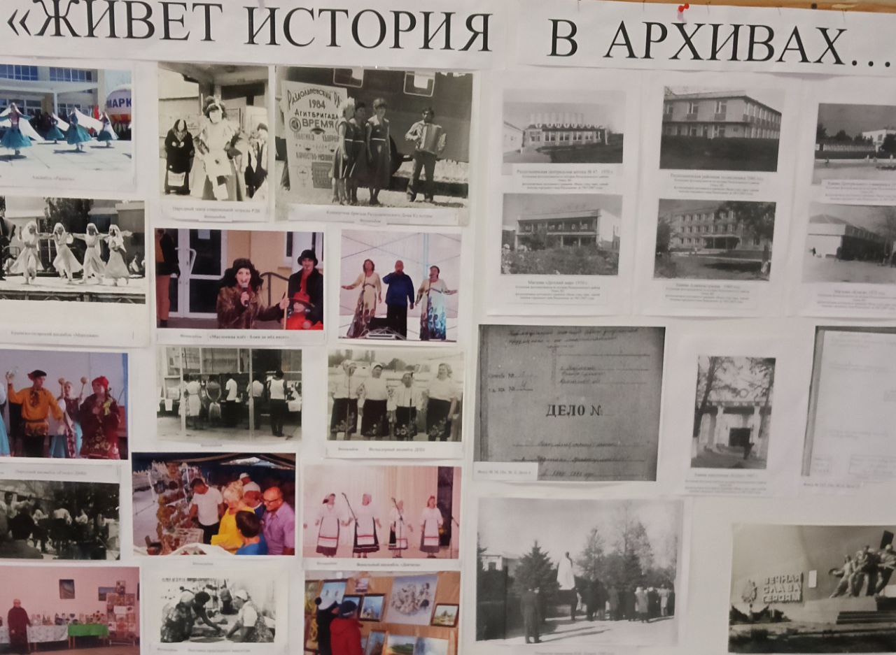 Выставочный стенд оформлен фотографиями мероприятий, которые проводил архивный сектор в разные годы - это выставки, дни открытых дверей, школьные уроки, экскурсии по архивохранилищам.