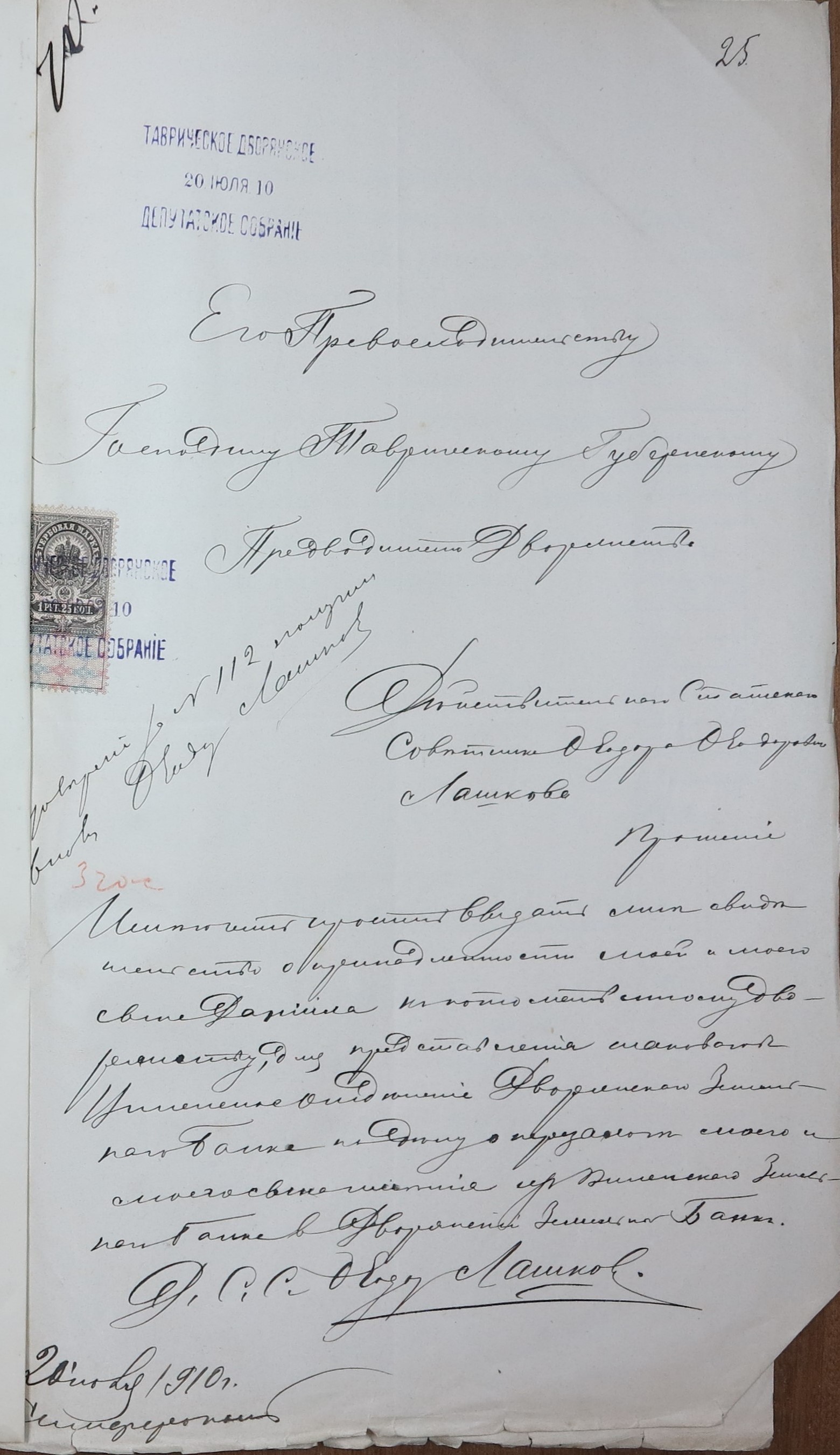 Ко дню рождения выдающегося историка, архивиста, крымоведа, члена Таврической ученой архивной комиссии (ТУАК) Фёдора Фёдоровича Лашкова, Госархив представляет вниманию документы, отражающие важные моменты его жизни. На хранении в архиве находится прошение от 20 июля 1910 года действительного статского советника Фёдора Лашкова к Таврическому губернатору о выдаче ему удостоверения о принадлежности к потомственному дворянству для предоставления в Виленское отделение Дворянского Земельного банка.