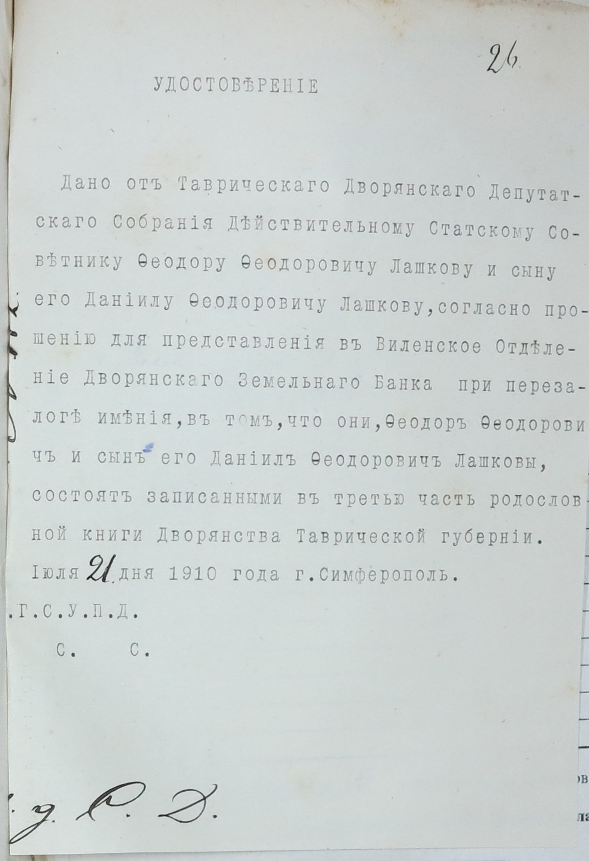 К документу также прилагается запрашиваемое удостоверение, выданное Таврическим Дворянским Депутатским Собранием Федору Федоровичу Лашкову от 21 июля 1917 года о том, что он и его сын Даниил Фёдорович состоят записанными в третью часть родословной книги Дворянства Таврической губернии.