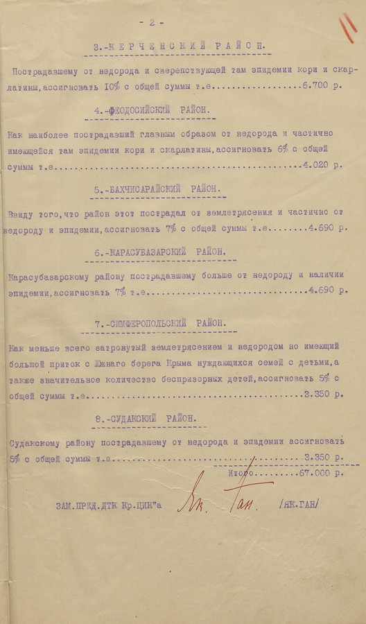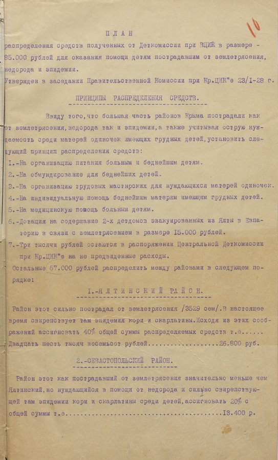 На хранении в фондах Государственного архива Республики Крым находится документ — «План распределения средств, полученных от Деткомиссии при ВЦИК в размере 85 000 рублей для оказания помощи детям, пострадавшим от землетрясения, недорода и эпидемии». План был утвержден заседанием Правительственной комиссии при КрымЦИКе 23 января 1928 года.