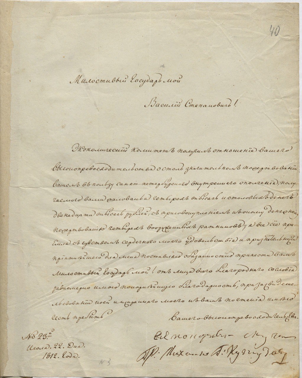 В письме, датированном 22 июля 1812 года, М.И. Кутузов выражает искреннюю признательность В.С. Попову за щедрое пожертвование в пользу Санкт-Петербургского внутреннего ополчения. Речь идет о сумме «жалования четырех тысяч и столовых денег двенадцати тысяч рублей».