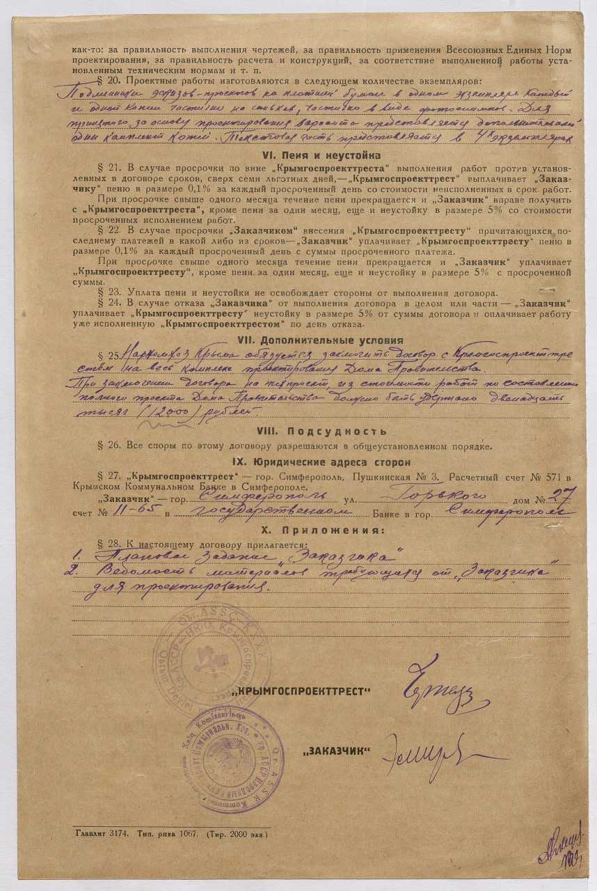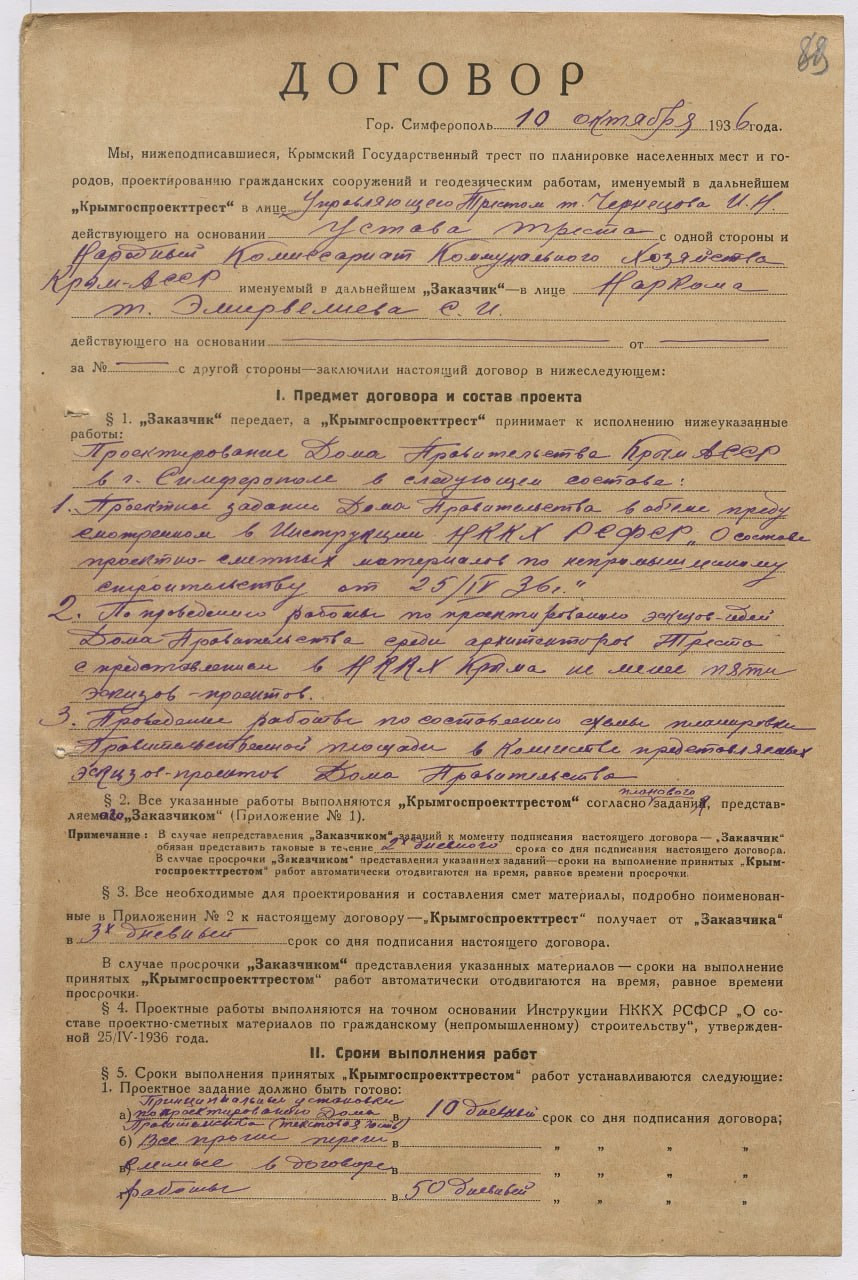 В 1950-е гг. в г. Симферополе было начато строительство здания Дома Советов Крымской области (ныне Совет министров Республики Крым), которое завершилось в 1960 г. В Государственном архиве Республики Крым сохранилось значительное количество фотодокументов, запечатлевших этапы его возведения. Идея сооружения единого административного здания для нужд крымского правительства отражена в документах 1930-х годов. В этот период руководством полуострова рассматривался масштабный проект по благоустройству центра столицы. Еще в 1933 г. Советом народных комиссаров Крымской АССР было принято решение о выделении земельного участка размером 4 га в центре г. Симферополя. Претворение в жизнь указанного проекта, вопросы возведения здания и подготовки проектно-сметной документации были возложены на Народный комиссариат коммунального хозяйства Крымской АССР. В 1936 г. в качестве подрядчика выступил «Крымгоспроекттрест». Однако в реализацию задуманного вмешалась Великая Отечественная война.