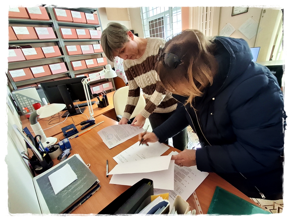 Главный специалист отдела формирования Архивного фонда Республики Крым Ольга Обухова, курирующая организацию, и отвечающая за делопроизводство и архив в образовательном учреждении Виктория Пьясор рассмотрели вопросы состояния текущей готовности школы искусств к проведению эвакуационных мероприятий, в частности - картонирование архивных документов, подлежащих эвакуации, приобретение упаковочных мешков для документов.