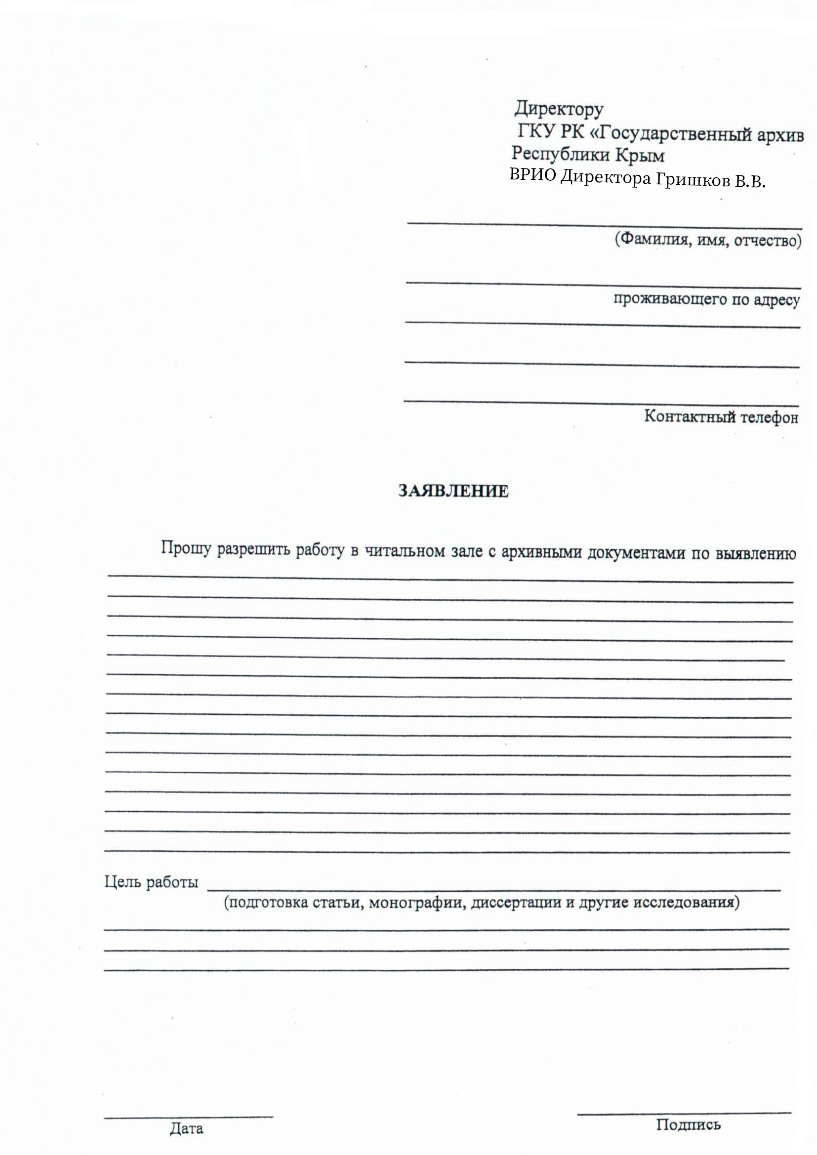 Для обеспечения возможности работы в читальном зале по предварительному заказу дел необходимо направить в ГКУ РК «Государственный архив Республики Крым» заполненные формы документов: