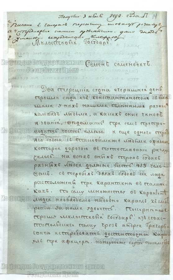 Архивный шифр: фонд № 799, опись № 3, ед. хр. № 201, лист №№ 14-14 об.
