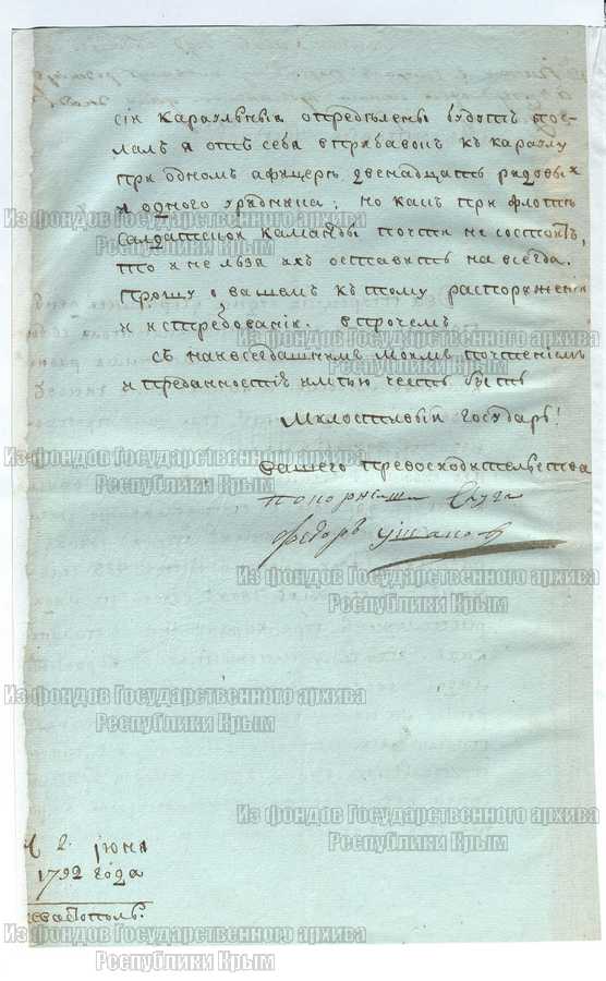 Название (заголовок) документа: Рапорт (письмо) Ф.Ф. Ушакова С.С. Жегулину