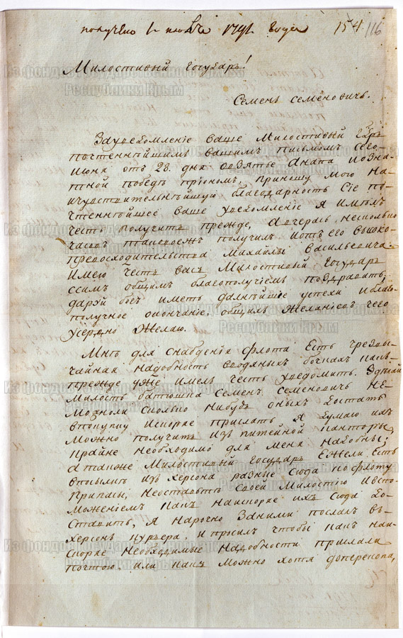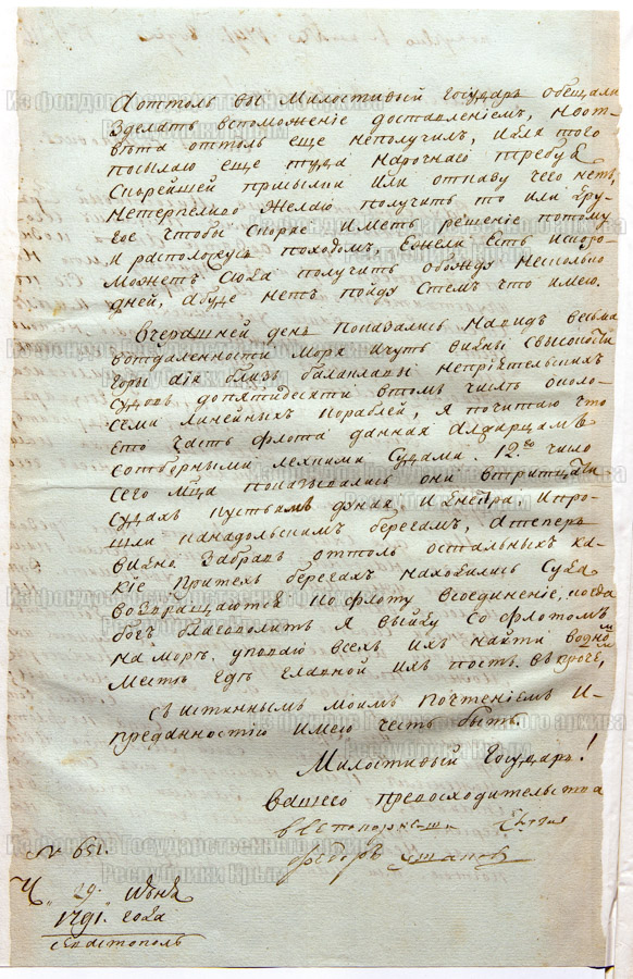 Аннотация: Рапорт (письмо) контр-адмирала Федора Федоровича Ушакова правителю Таврической области Семену Семеновичу Жегулину о необходимости выхода с флотилией в море для слежки за неприятельскими судами, которые приближаются к Балаклаве.