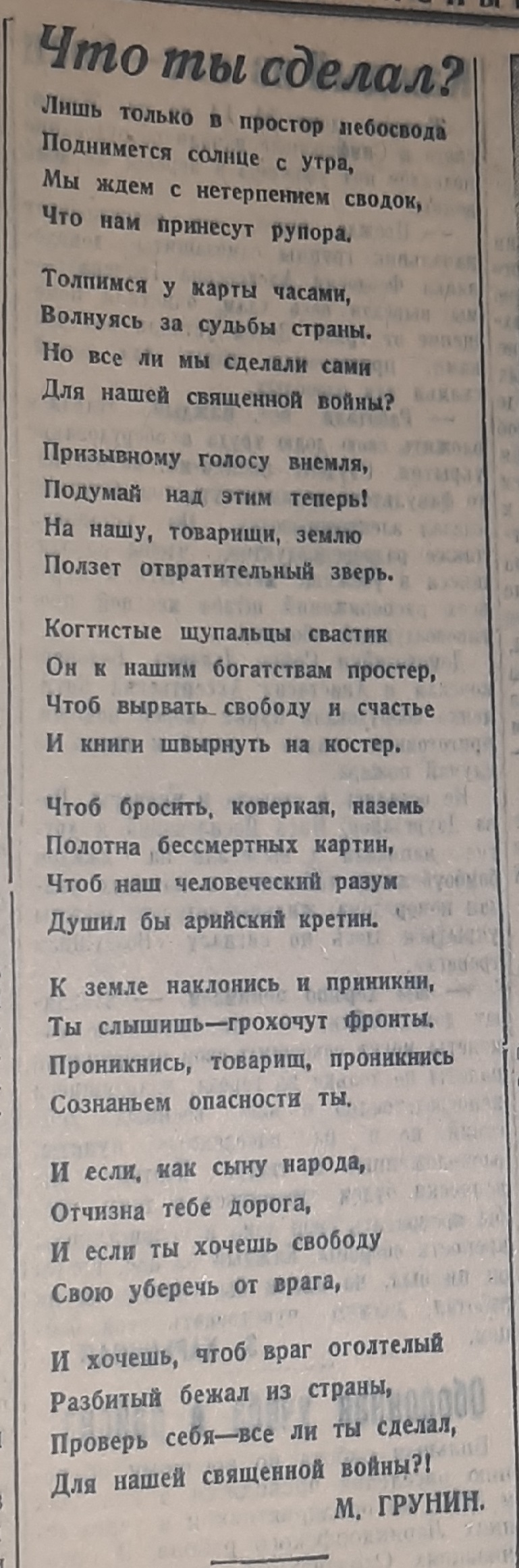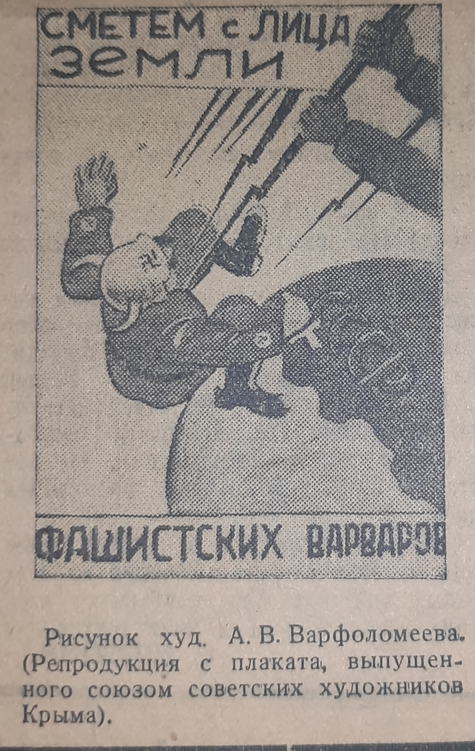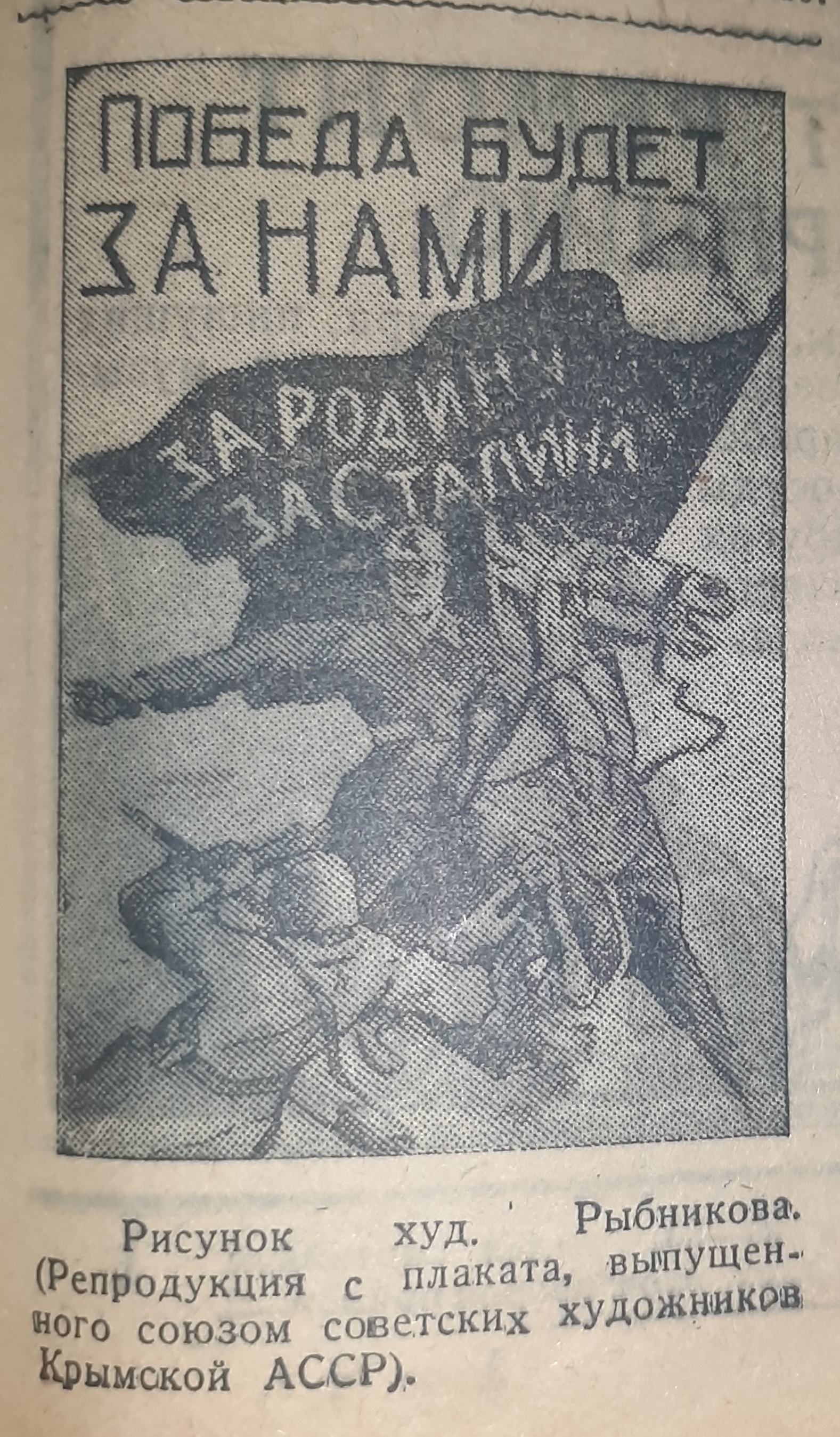 Материалы газеты «Красный Крым» (в архиве на хранении имеются выпуски этой газеты за июнь-сентябрь 1941 г.) во многом иллюстрируют те информационные сводки, которые получали обкомы ВКП(б) и ВЛКСМ с мест. В первую очередь, повторюсь еще раз, это небывалый патриотический подъем, начиная с 24 июня 1941 г. на страницах газеты публиковались сообщения о проходящих по предприятиям, учреждениям, в колхозах и совхозах митингах, формировании народного ополчения. Рассказывали корреспонденты о проведении учений МПВО, создании санитарных дружин, строительстве укреплений и бомбоубежищ. Однако, основное внимание было обращено на сбор урожая, которому была посвящена большая часть материалов. Отдельно следует отметить и огромное количество агитационных материалов. И если в первых военных номерах «Красный Крым» публиковал репродукции с плакатов, выпущенных издательством «Искусство», то уже со второй половины июля на страницах газеты появляются репродукции с плакатов, рисунки и карикатуры местных крымских художников.
