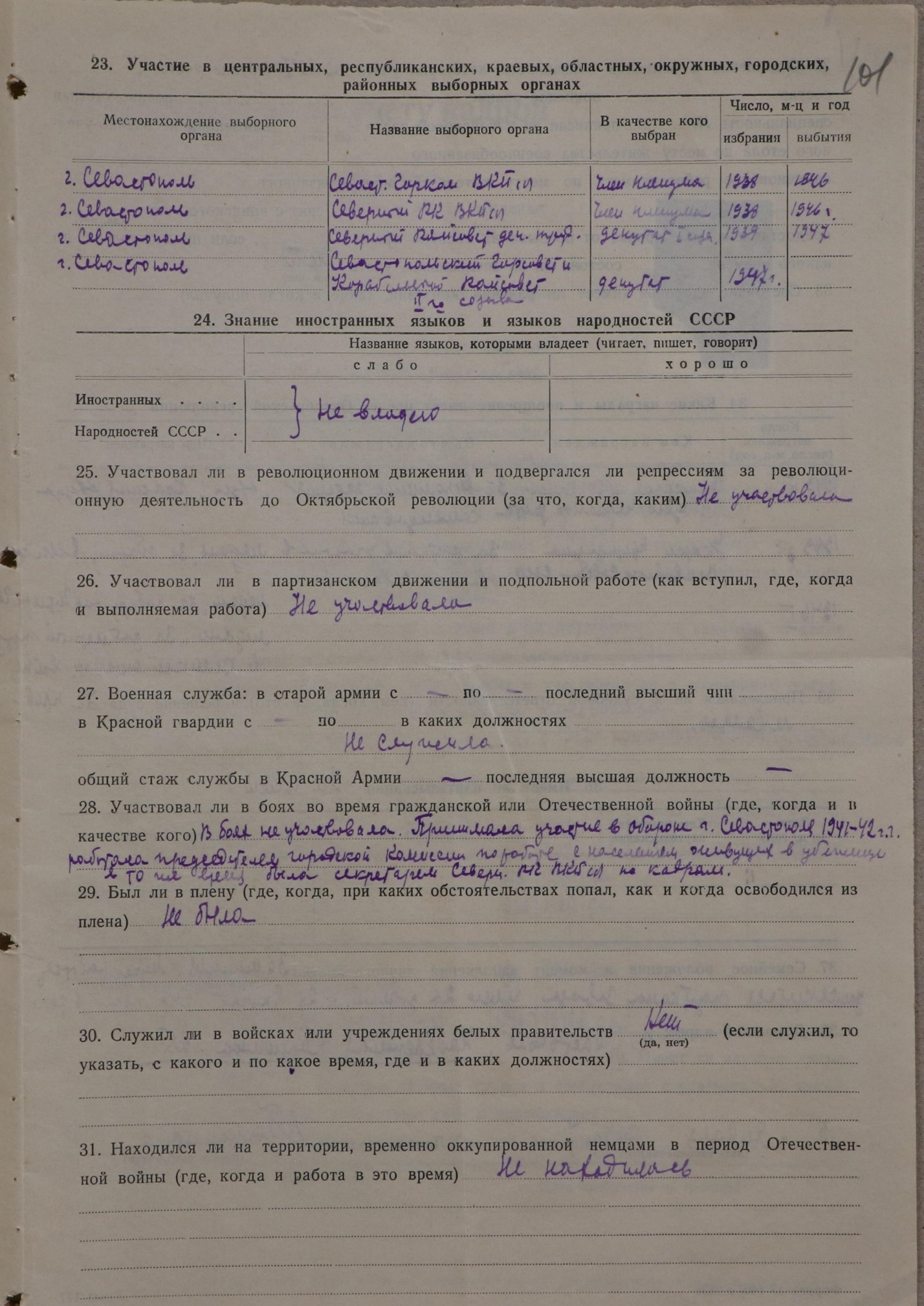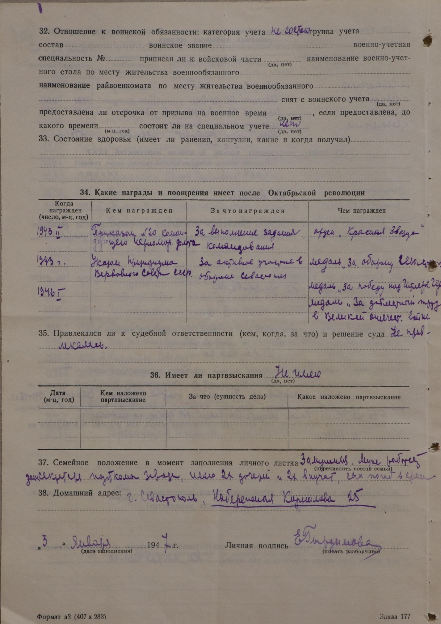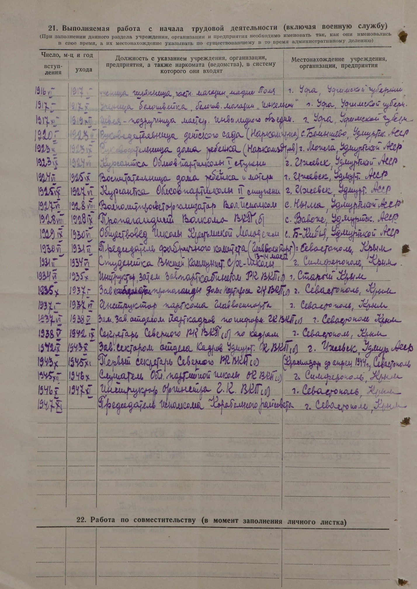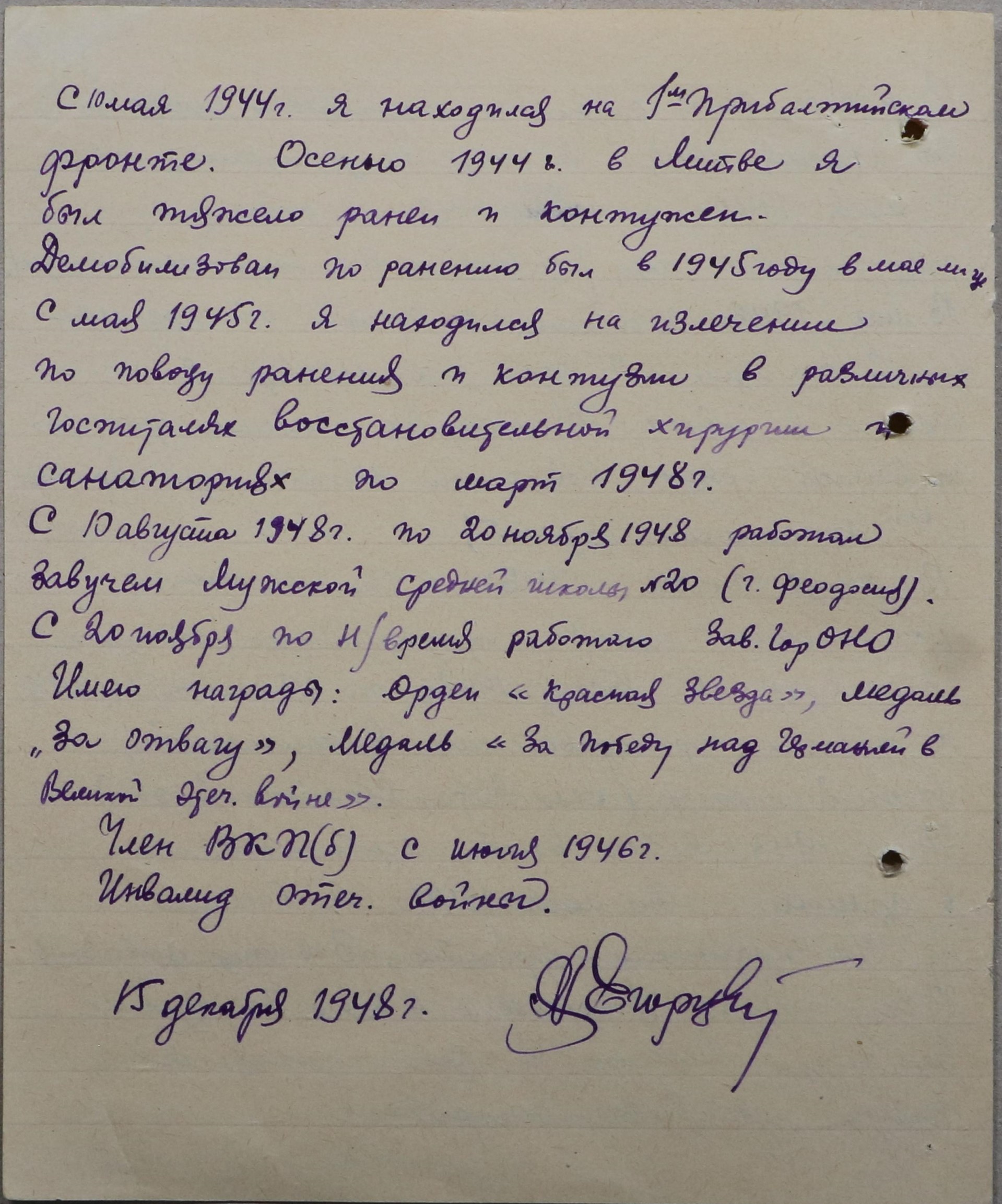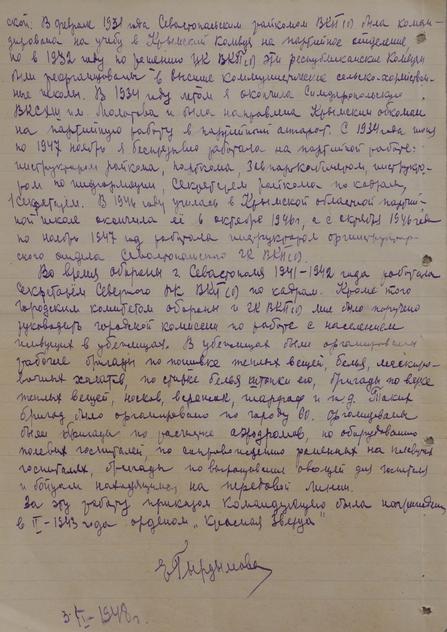 «…Во время обороны г. Севастополя 1941-1942 года работала секретарём Северного РК ВКП(б) по кадрам. Кроме того, Городским комитетом обороны и ГК ВКП(б) мне было поручено руководить городской комиссией по работе с населением, живущих в убежищах. В убежищах были организованы рабочие бригады по пошивке теплых вещей, белья, маскировочных халатов, по стирке белья, штопки его, бригады по вязке теплых вещей, носков, варежек, шарфов и т.д. Таких бригад было организовано по городу 60. Организованы были бригады по расчистке аэродромов, по оборудованию полевых госпиталей, по сопровождению раненых на плавучих госпиталях, бригады по выращиванию овощей для госпиталя и бойцам, находящимся на передовой линии. За эту работу приказом Командующего была награждена в 1943 году орденом «Красная звезда»».