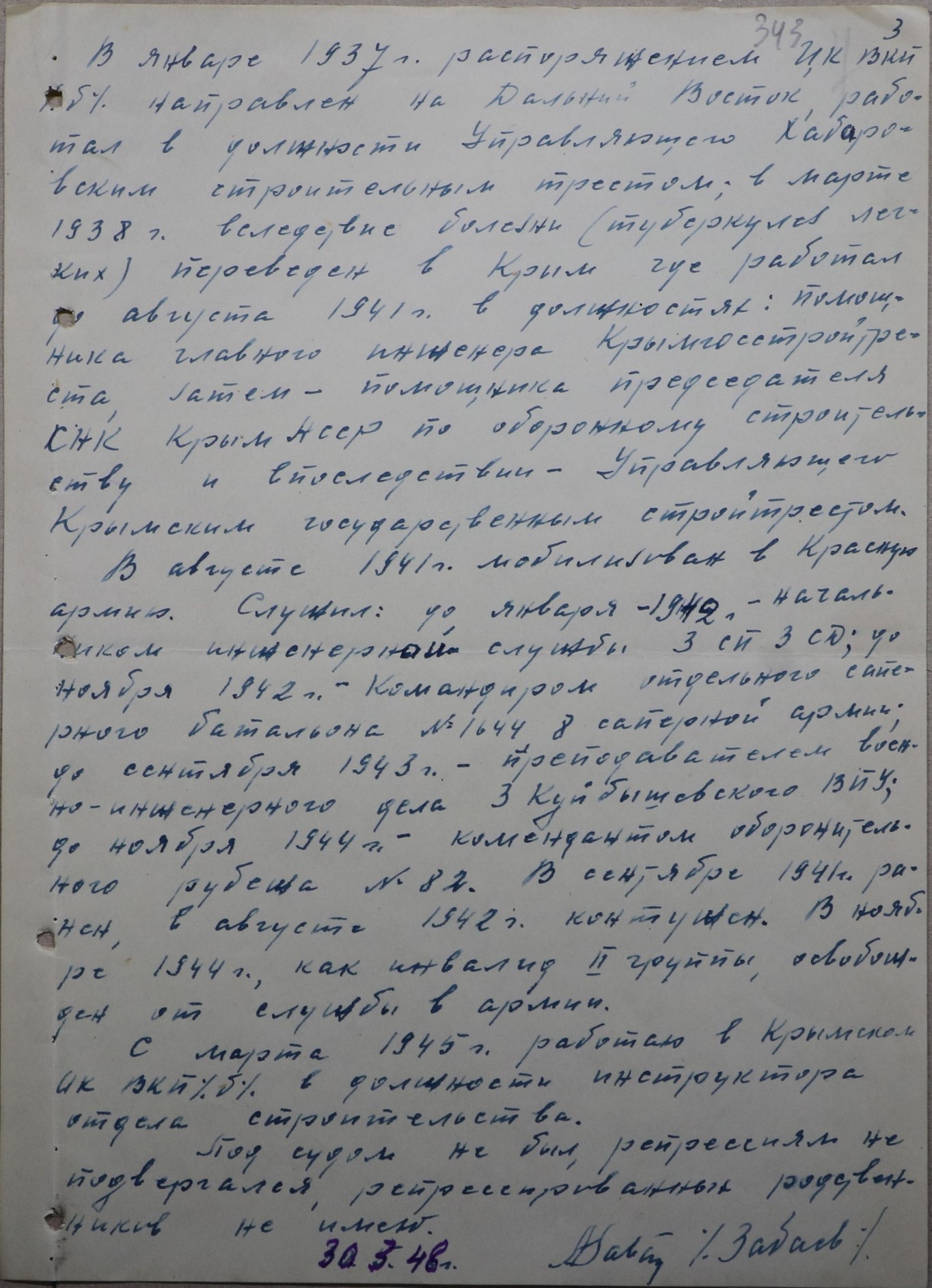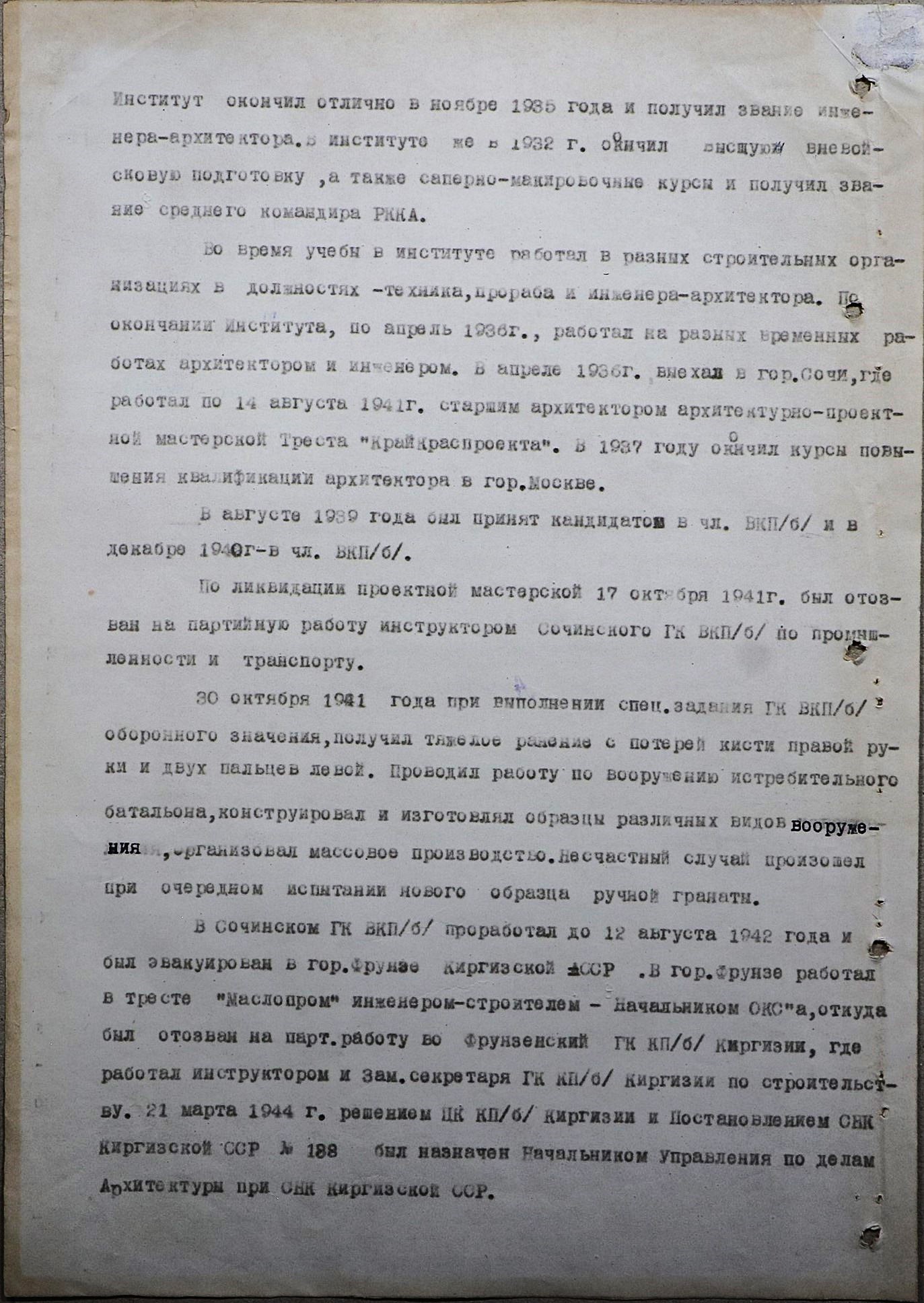 «…В августе 1941 г. мобилизован в Красную Армию. Служил: до января 1942 г. начальником инженерной службы… до ноября 1942 г. – командиром отдельного саперного батальона № 1644 8-ой саперной армии; до сентября 1943 г. – преподавателем военно-инженерного дела 3 Куйбышевского ВПУ; до ноября 1944 г. – комендантом оборонительного рубежа № 82. В сентябре 1941 г. ранен, в августе 1942 контужен. В ноябре 1944 г. как инвалид II группы, освобожден от службы в армии».
