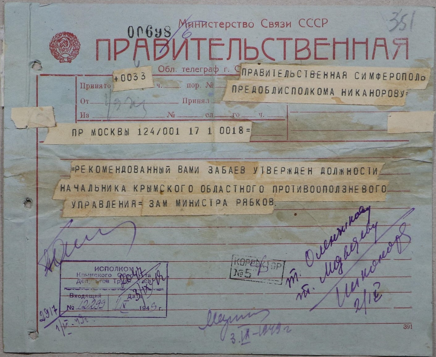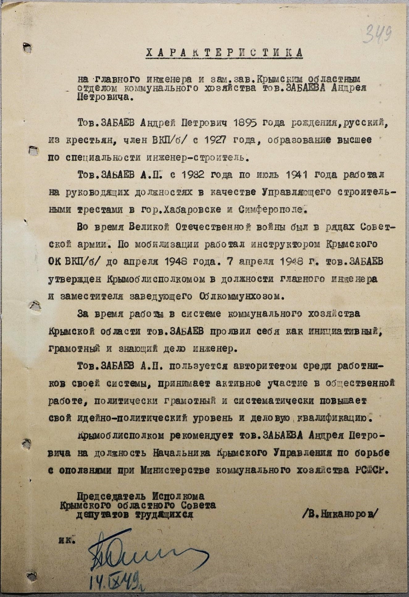 В выставке представлено фото из личного листка по учету кадров Забаева А.П., его характеристика в должности главного инженера и заместителя заведующего коммунального хозяйства, а также телеграмма об утверждении Забаева А.П. в должности начальника Крымского областного противооползневого управления.