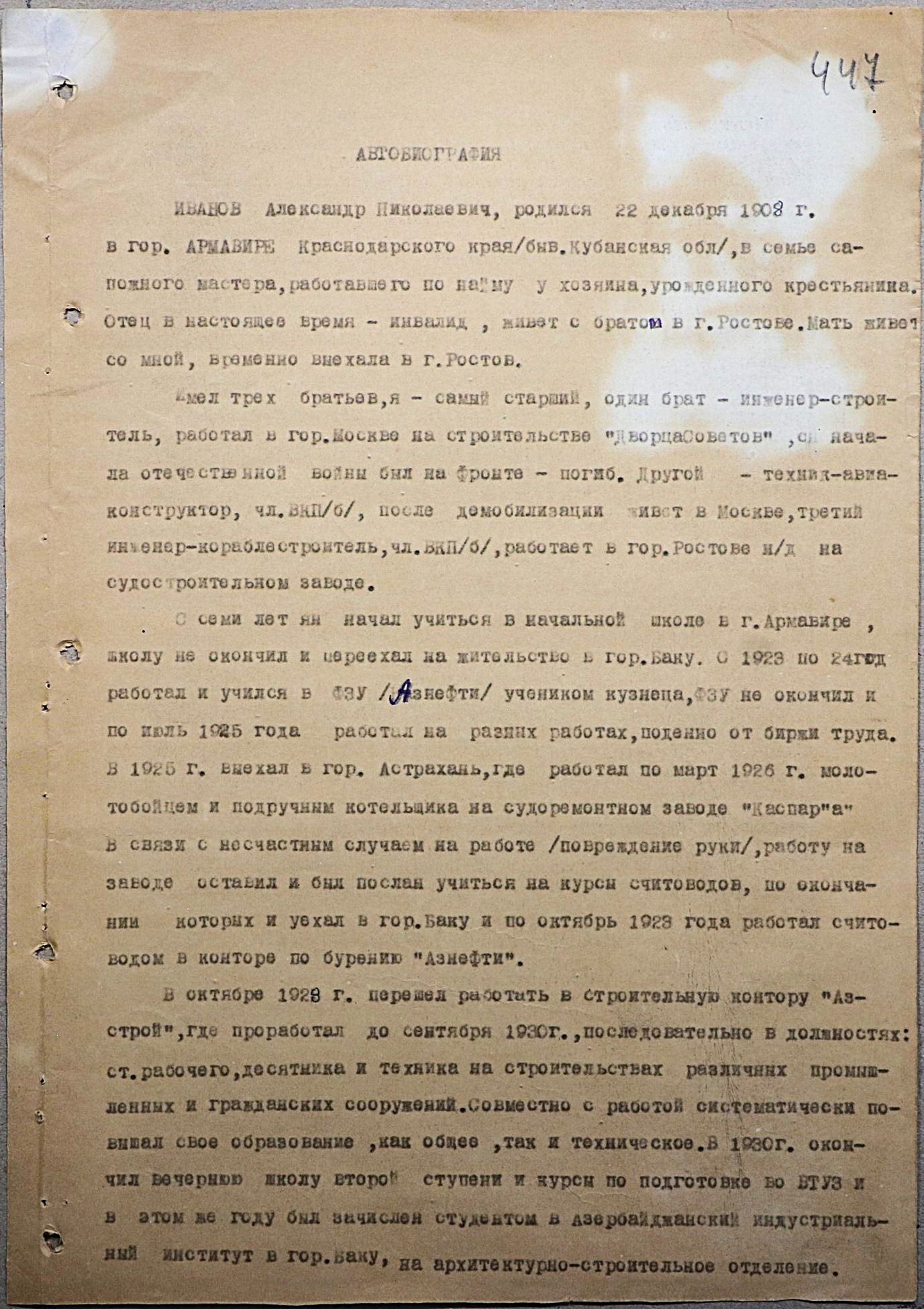 Иванов Александр Николаевич это пример человека, который боролся не на фронте, а в тылу. Родился 22 декабря 1908 г. в городе Армавир Краснодарского Края в семье сапожного мастера. До войны работал молотобойцем и счетоводом, позже поступил в Азербайджанский индустриальный институт в г. Баку на архитектурно-строительное отделение. Учась в институте, прошел высшую вневойсковую подготовку, а также саперно-маскировочные курсы и получил звание среднего командира РККА. По август 1941 года работал старшим архитектором архитектурно-проекторной мастерской треста «КрайКраспроекта» г. Сочи.