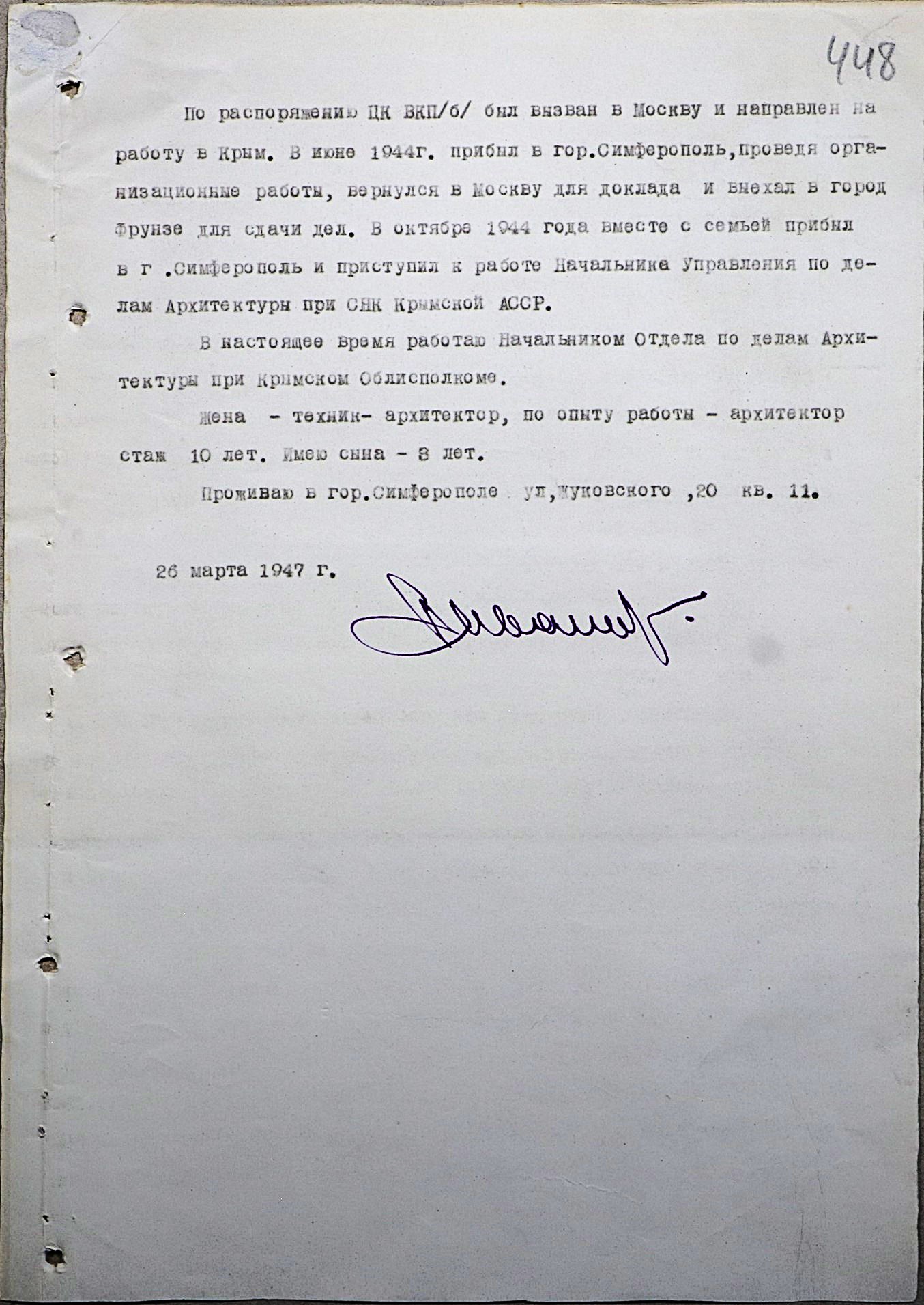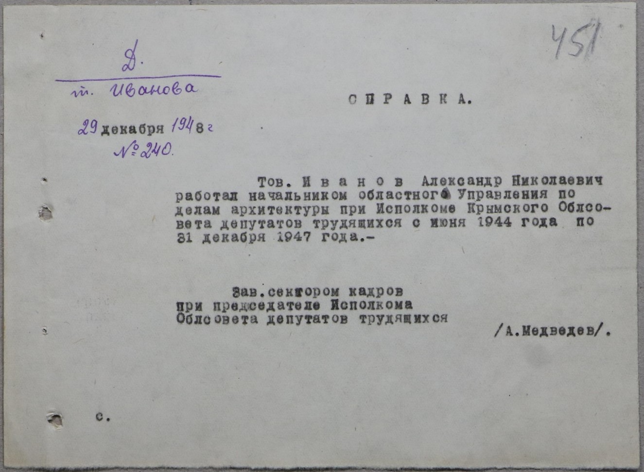 В 1944 году Александр Иванов с семьей переехал в Симферополь и устроился на должность Начальника Управления по делам Архитектуры при СНК Крымской АССР, о чем свидетельствует справка о стаже, хранящаяся в фонде 315 (Крымоблисполком), описи лд, в деле № 6. Помимо прочего, в выставке представлено фото из его личного учетного листка и автобиография.