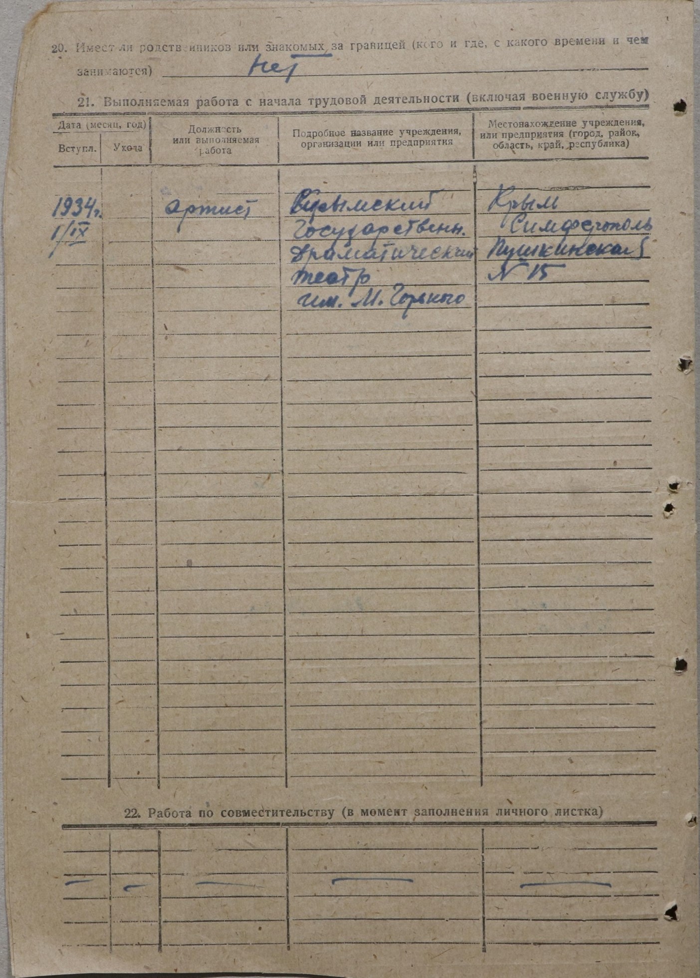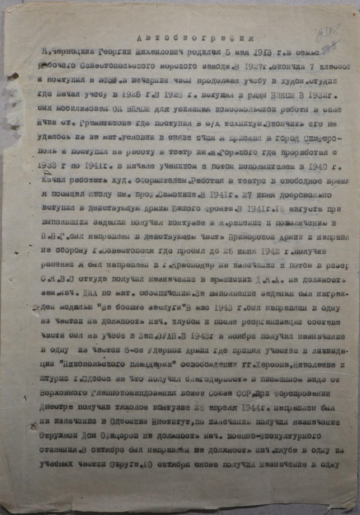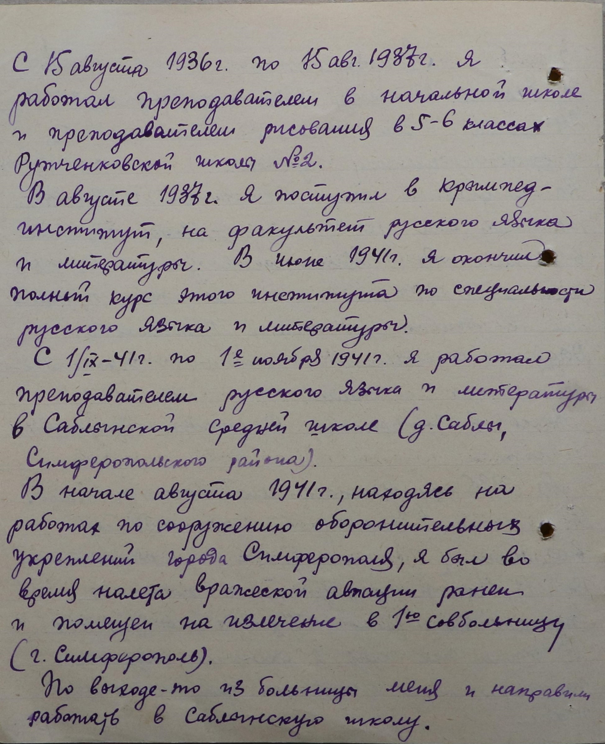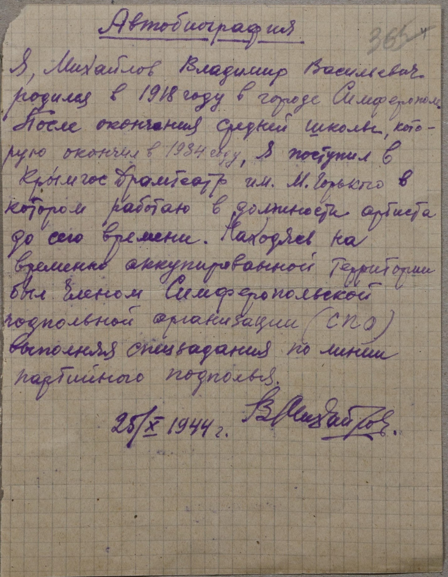 «…В 1934 году поступил в Крымгосдрамтеатр им. Горького, в котором работаю в должности артиста до сего времени. Находясь на временно оккупированной территории, был членом Симферопольской подпольной организации (СПО), выполняя спецзадания по линии партийного подполья».