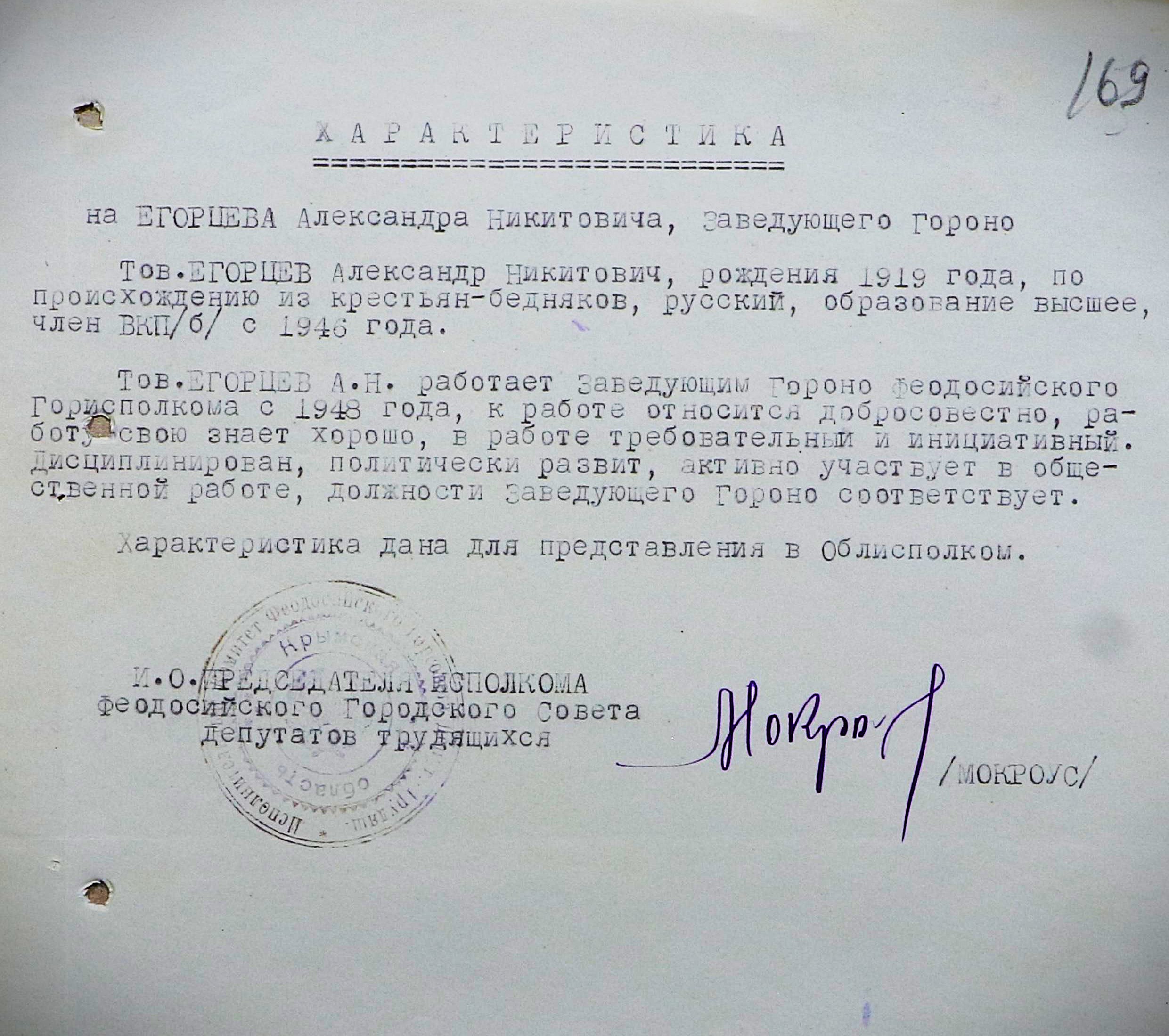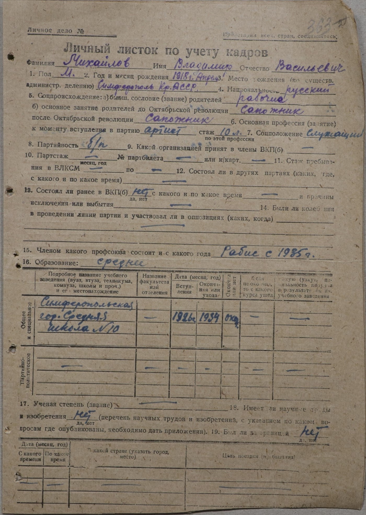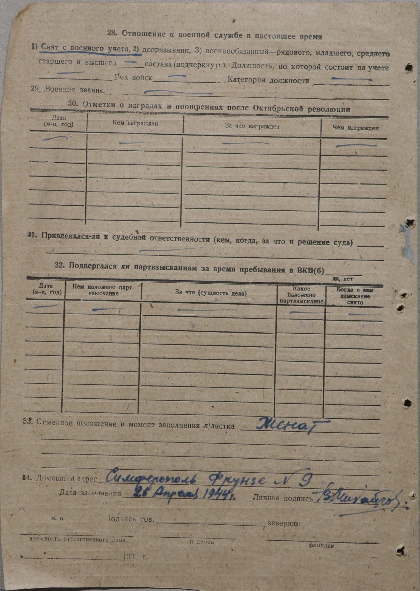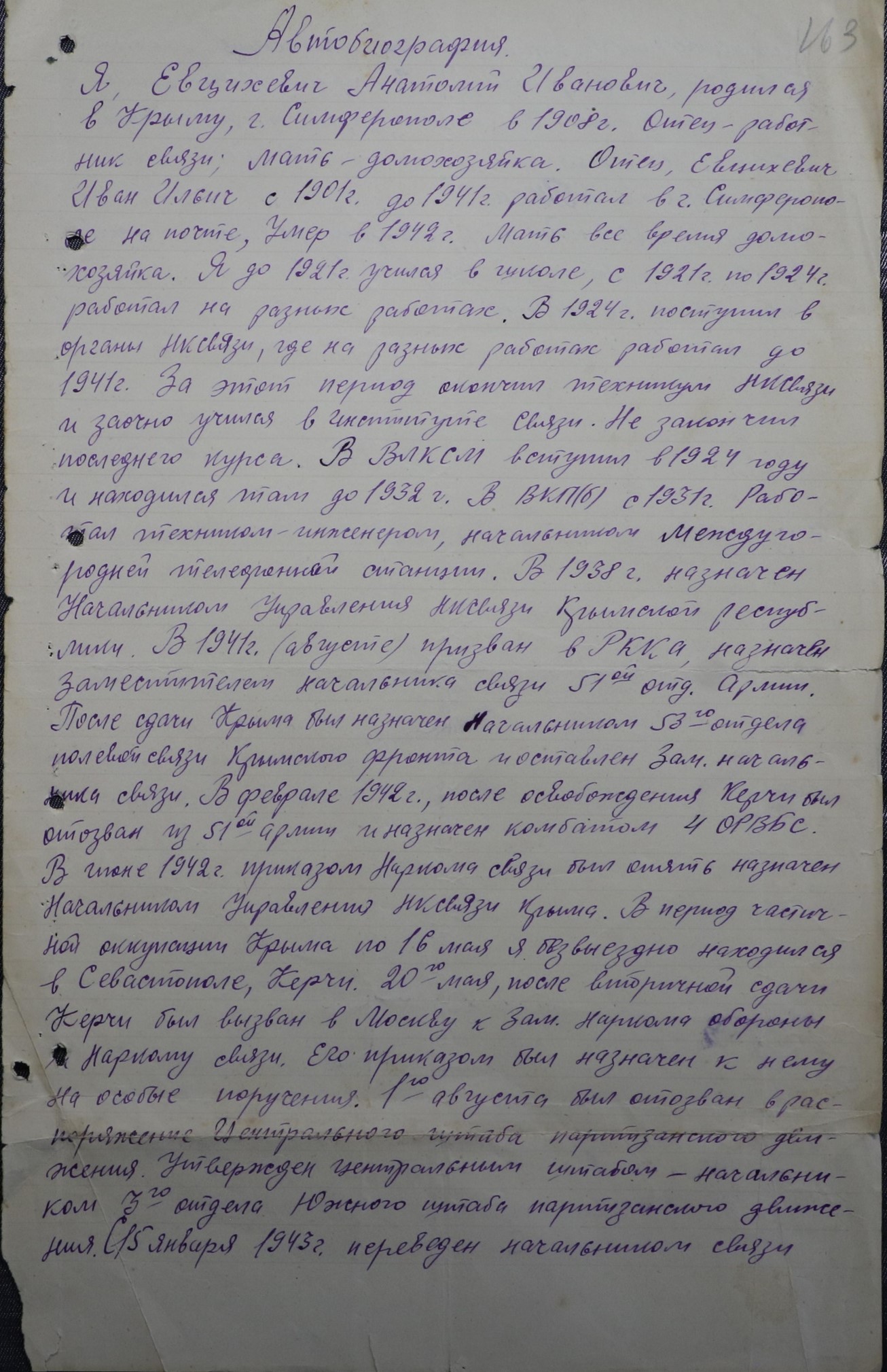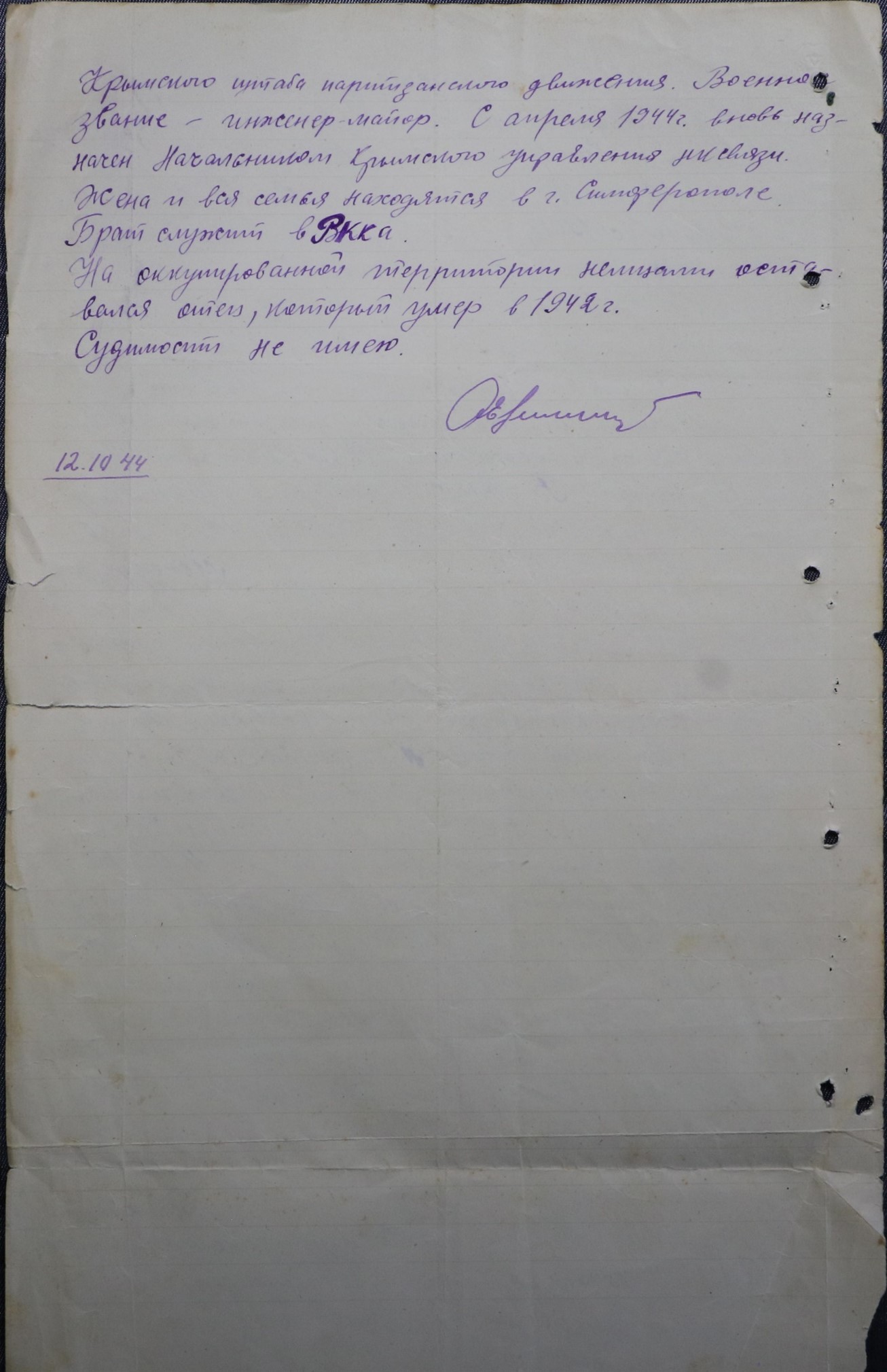 «…В 1934 году поступил в Крымгосдрамтеатр им. Горького, в котором работаю в должности артиста до сего времени. Находясь на временно оккупированной территории, был членом Симферопольской подпольной организации (СПО), выполняя спецзадания по линии партийного подполья».