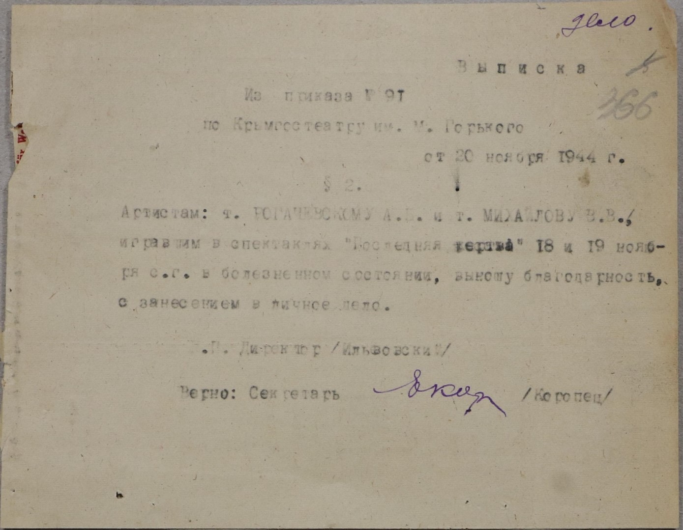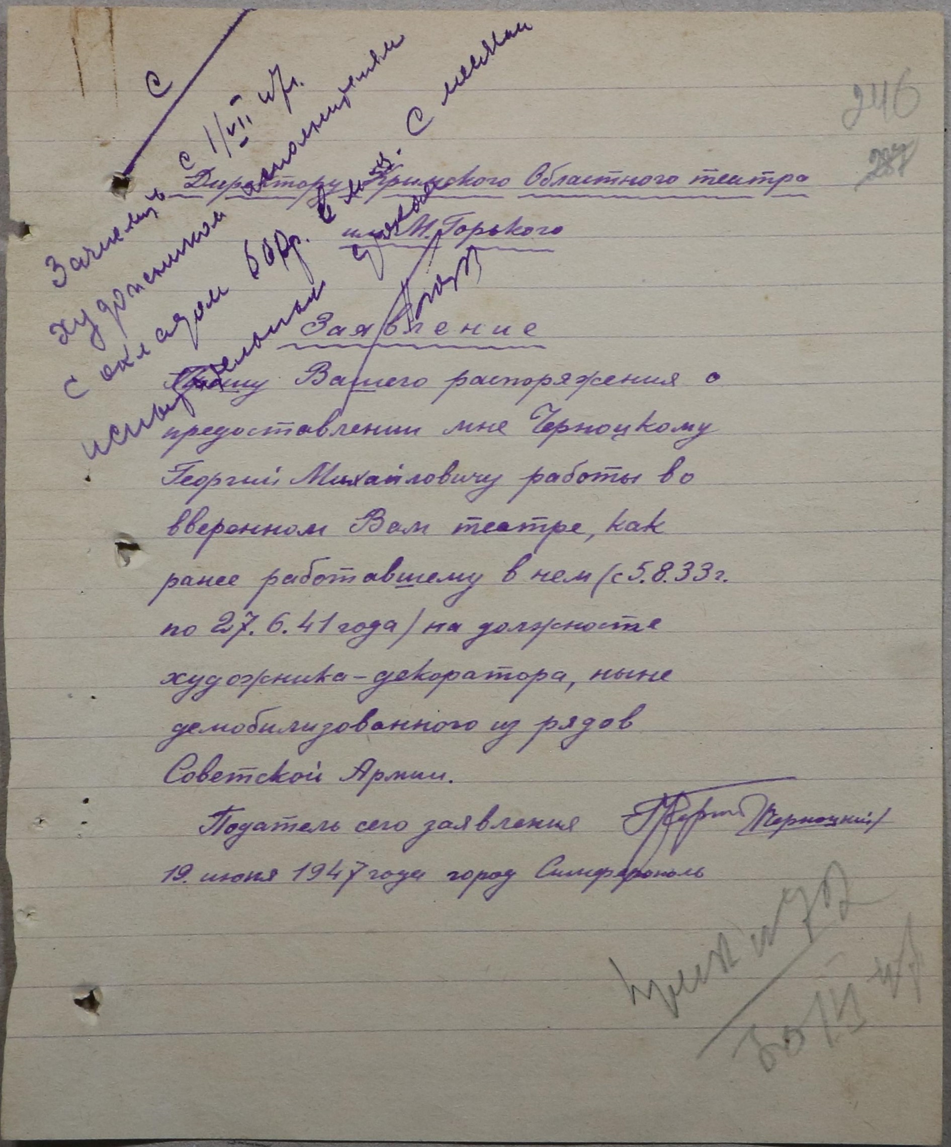 Также в выставке опубликовано его заявление с просьбой принять на работу в Крымский драматический театр им. Горького (Ф.344. Оп. 1-л. Д. 10. Л. 246).