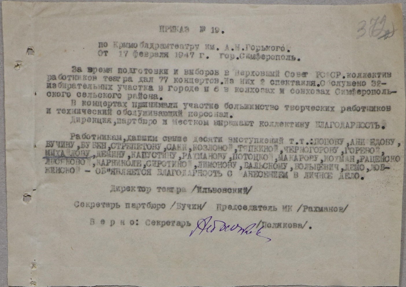 В экспозицию вошли материалы из личных дел сотрудников и руководителей Крымского драматического театра имени Горького, а также партийных организаций. Основной фонд представляет автобиографии и характеристики, содержащие информацию о профессиональной деятельности участников войны как в довоенный, так и в послевоенный периоды.