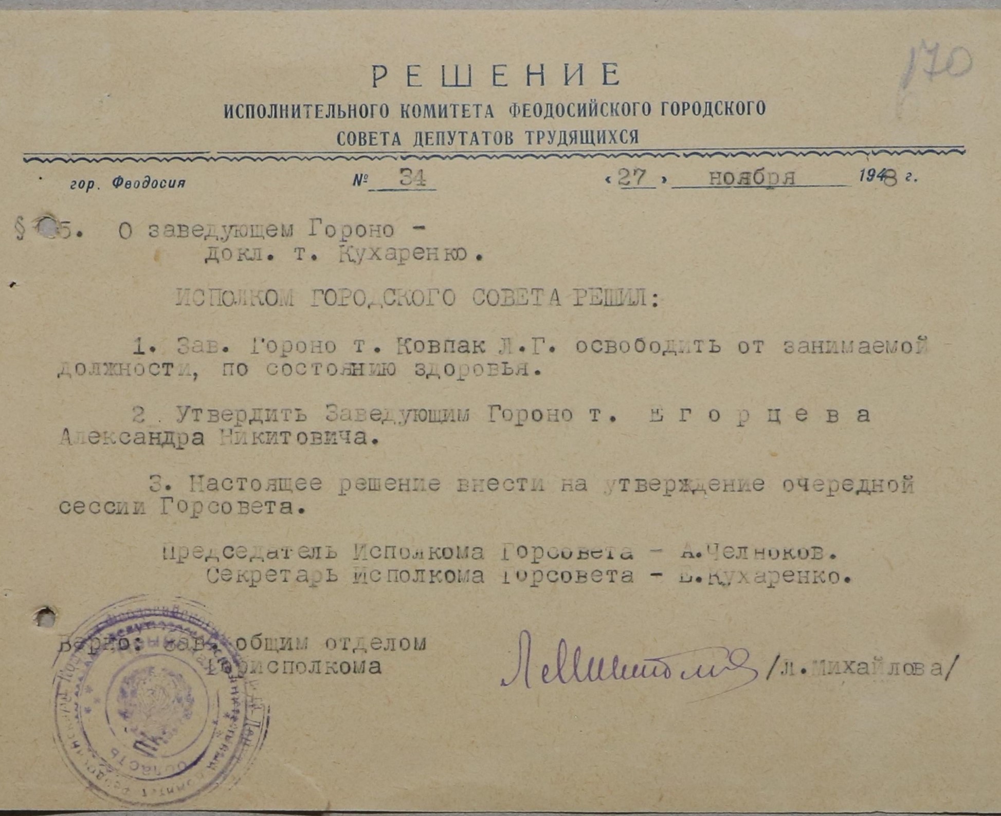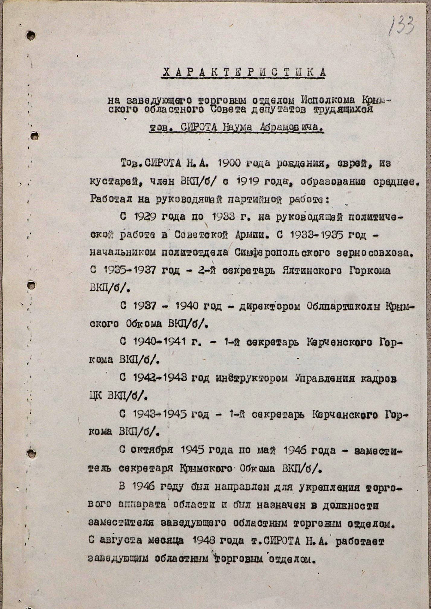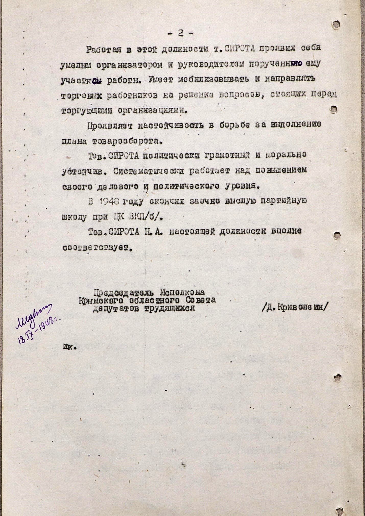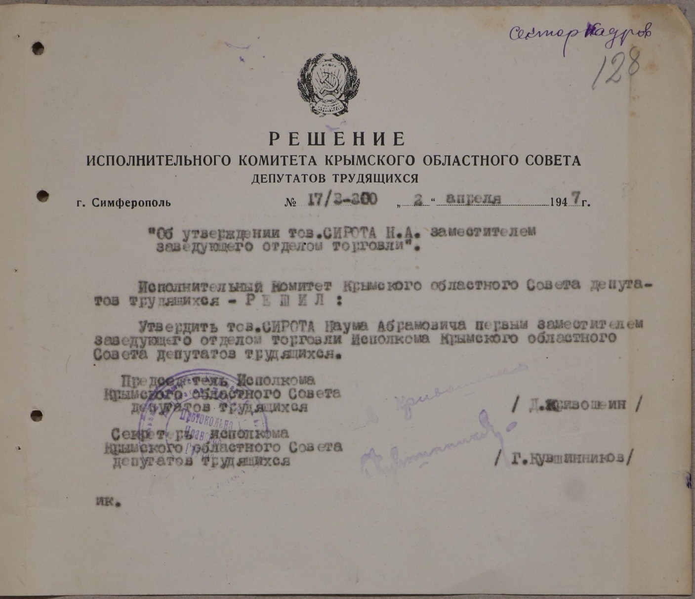 В выставке экспонировано решение исполнительного комитета Крымского Областного совета депутатов трудящихся об утверждении Сироты Н.А. заместителем заведующего отделом торговли, а также представлена его характеристика как заведующего торговым отделом Исполкома Крымского областного Совета депутатов трудящихся.