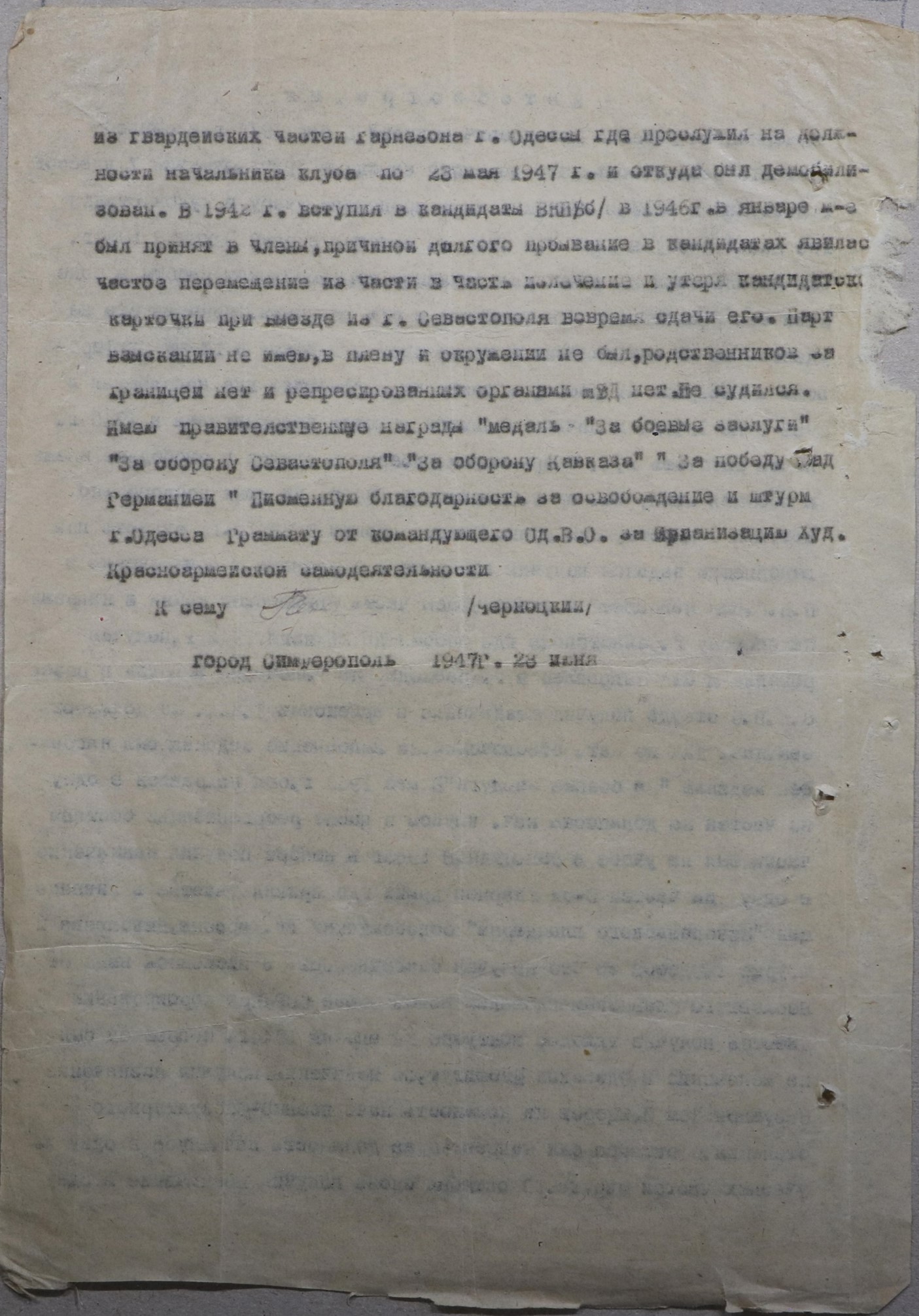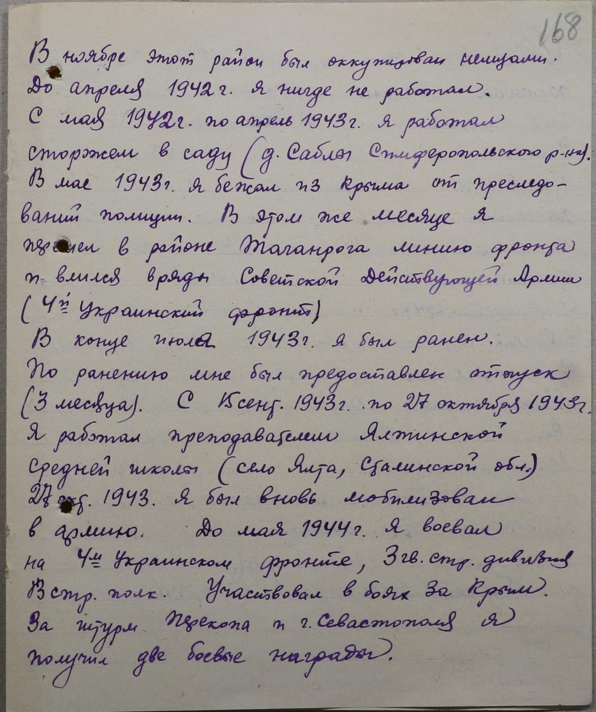 «...В 1941 г. 27 июня добровольно вступил в действующую Армию Южного Фронта. В 1941 г. 18 августа при выполнении задания получил контузию и л.(легкое) ранение и по излечению в ППГ был направлен в действующую часть Приморской Армии и направлен на оборону г. Севастополя, где пробыл до 26 июня 1942 г. Получив ранение я был направлен в Краснодар на излечение а потом в резерв в СКВО, откуда получил назначение в армейский ДКА на должность замначальника ДКА по материальному обеспечению. За выполнение задания был награжден медалью «За боевые заслуги...».