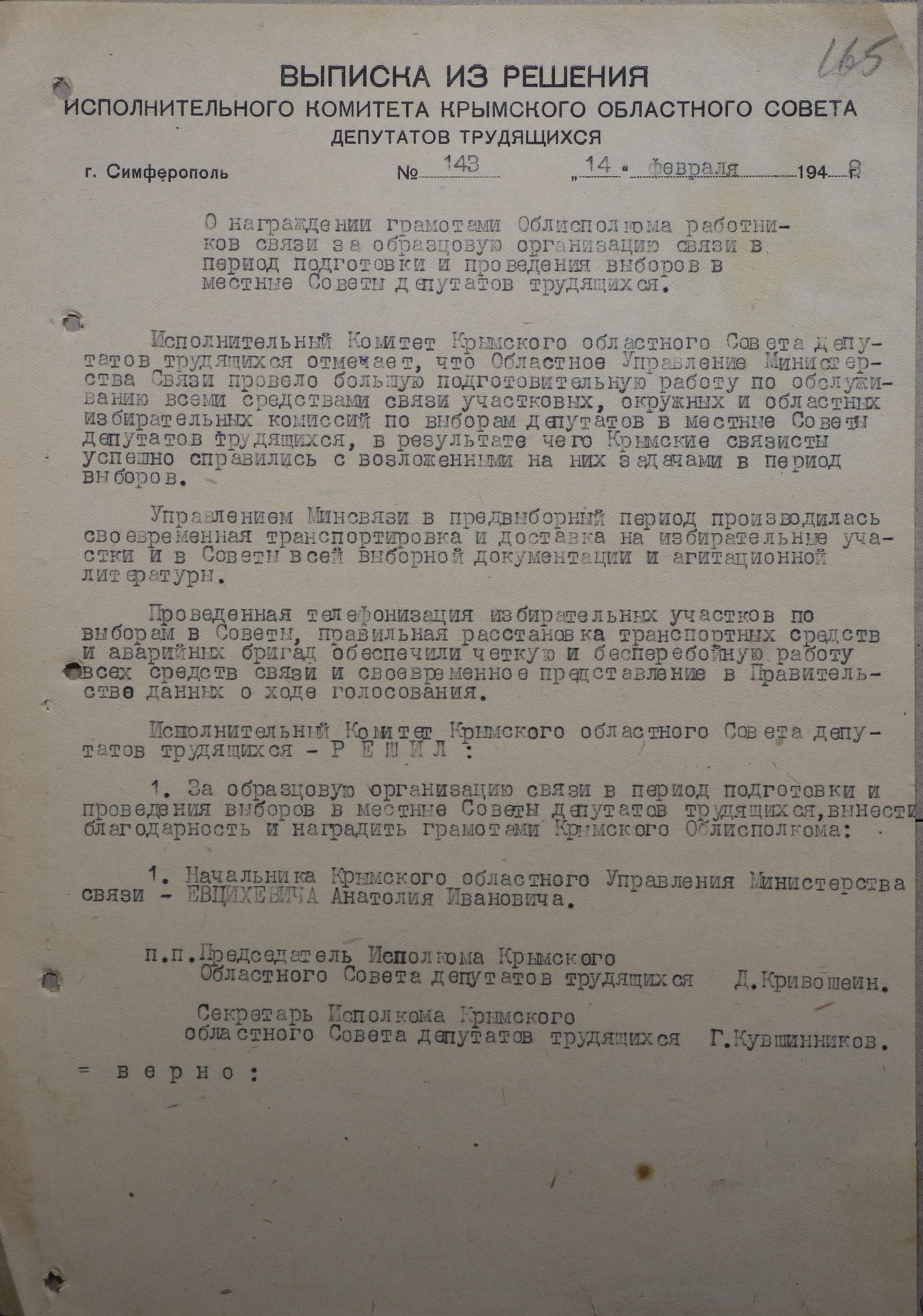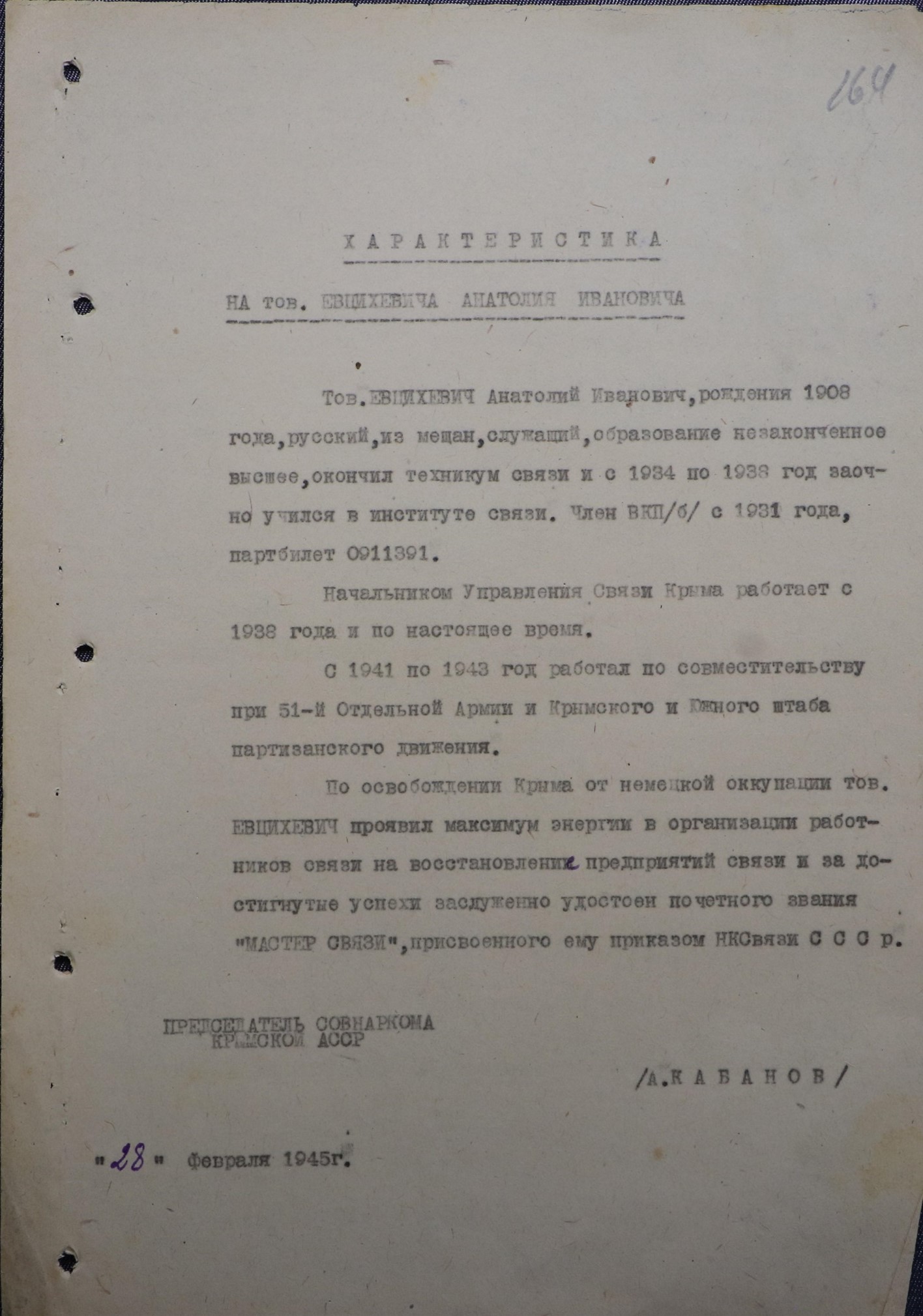 В выставке представлена его автобиография, выписка из решения исполнительного комитета Крымского областного Совета депутатов трудящихся, о награждении Евцихевича А.И. благодарственной грамотой Облисполкома за образцовую организацию связи. А также его характеристика в должности начальника Управления Связи Крыма, составленная председателем Совнаркома Крымской АССР.