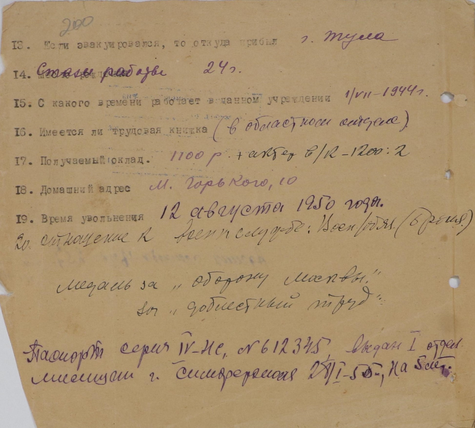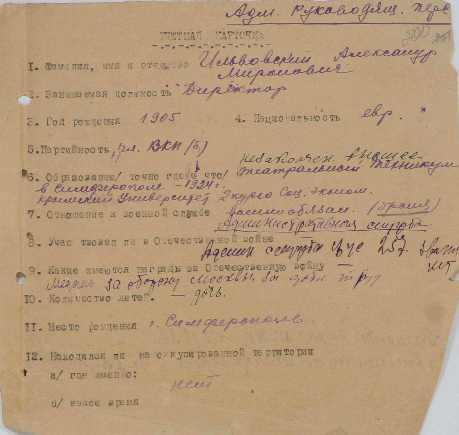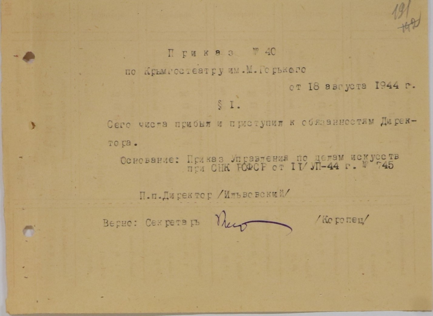 В фонде 344, описи лд. в деле № 17 хранится внутренний приказ Крымского областного драматического театре им. М. Горького о назначении на должность директора театра Ильвовского А.М. Интересен тот факт, что из-за нехватки бумаги подобные приказы нередко печатались на театральных билетах, о чем свидетельствует оборотный лист.