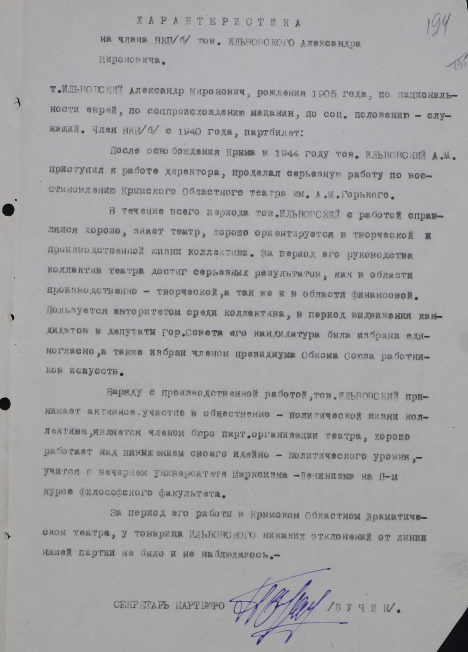 В этом же деле содержится его личная характеристика, составленная секретарем партбюро Бучиным, содержащей ценные сведения о работе театра и личностных качествах режиссера. В выставке также представлен личный листок Ильвовского с его биографическими данными.